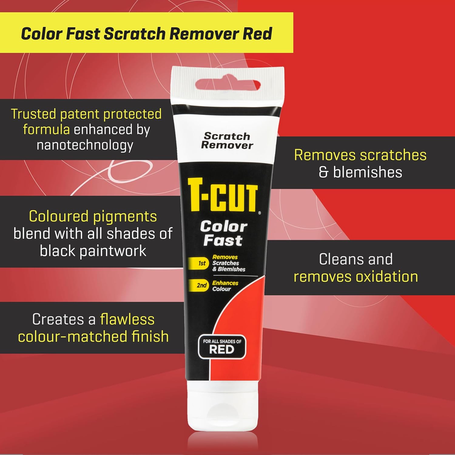 - T-Cut Colourfast Scratch remover (patent pending formula) removes scratches, scuffs, blemishes and adds colour in one easy application.