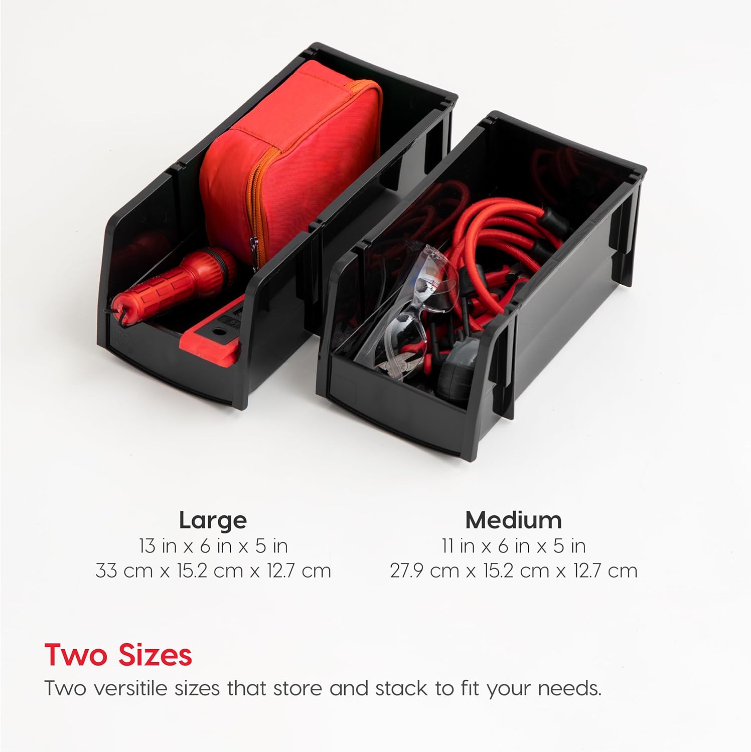 IRIS USA Plastic Shelf Bins Stackable Open Front Storage Bins Plastic Hanging Organizer Bin Caddy Basket for Hardware Crafts, Small Parts, Nuts and Bolts, Tool Storage - Large Black 8 Pack