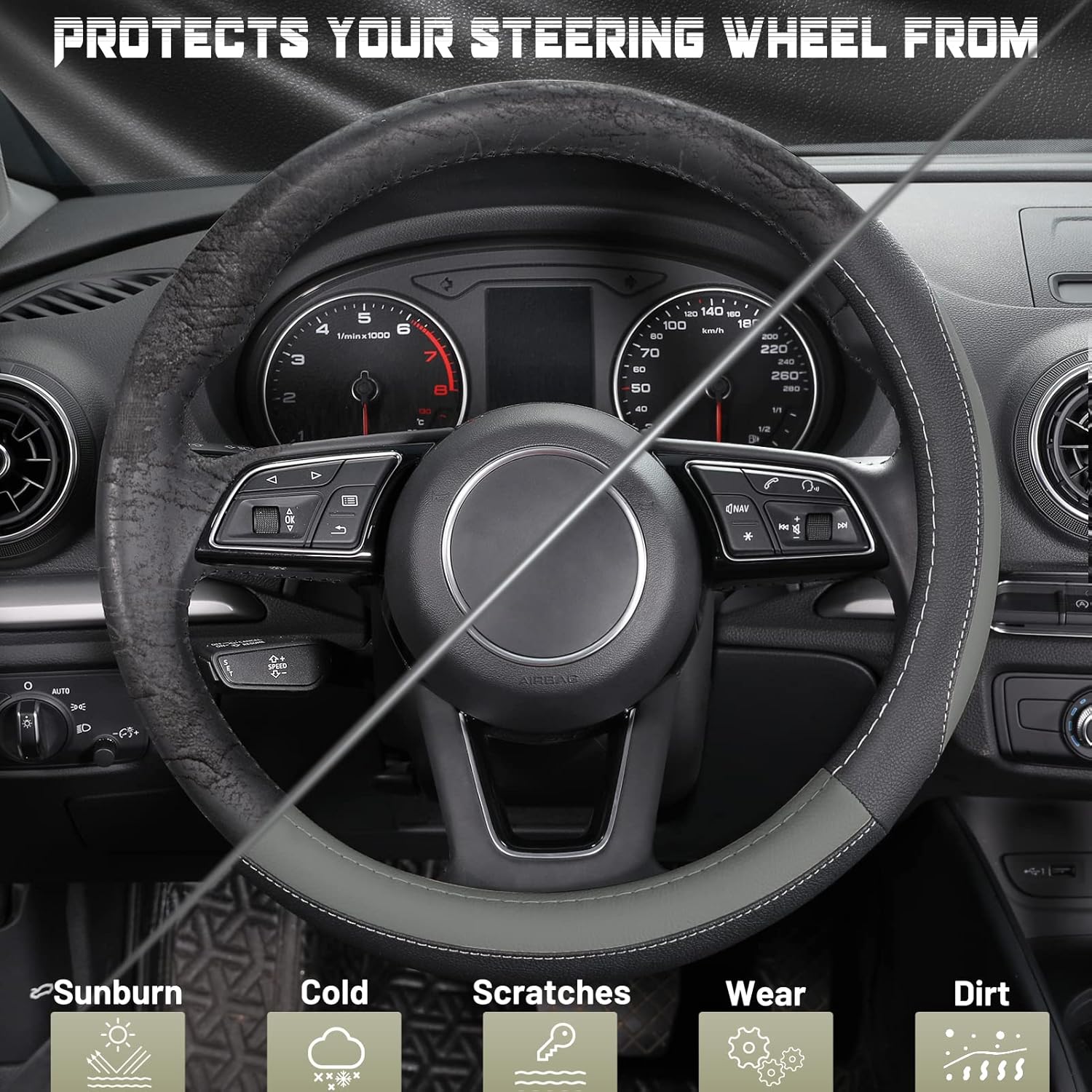 - NON-SLIP AND PROTECTION: Constructed from less slippery microfiber leather exterior and rubber lining, this car wheel cover adds secured safety performance when driving. It also protects your steering wheel from sunburn, scratches, fading, wear, and dirt.