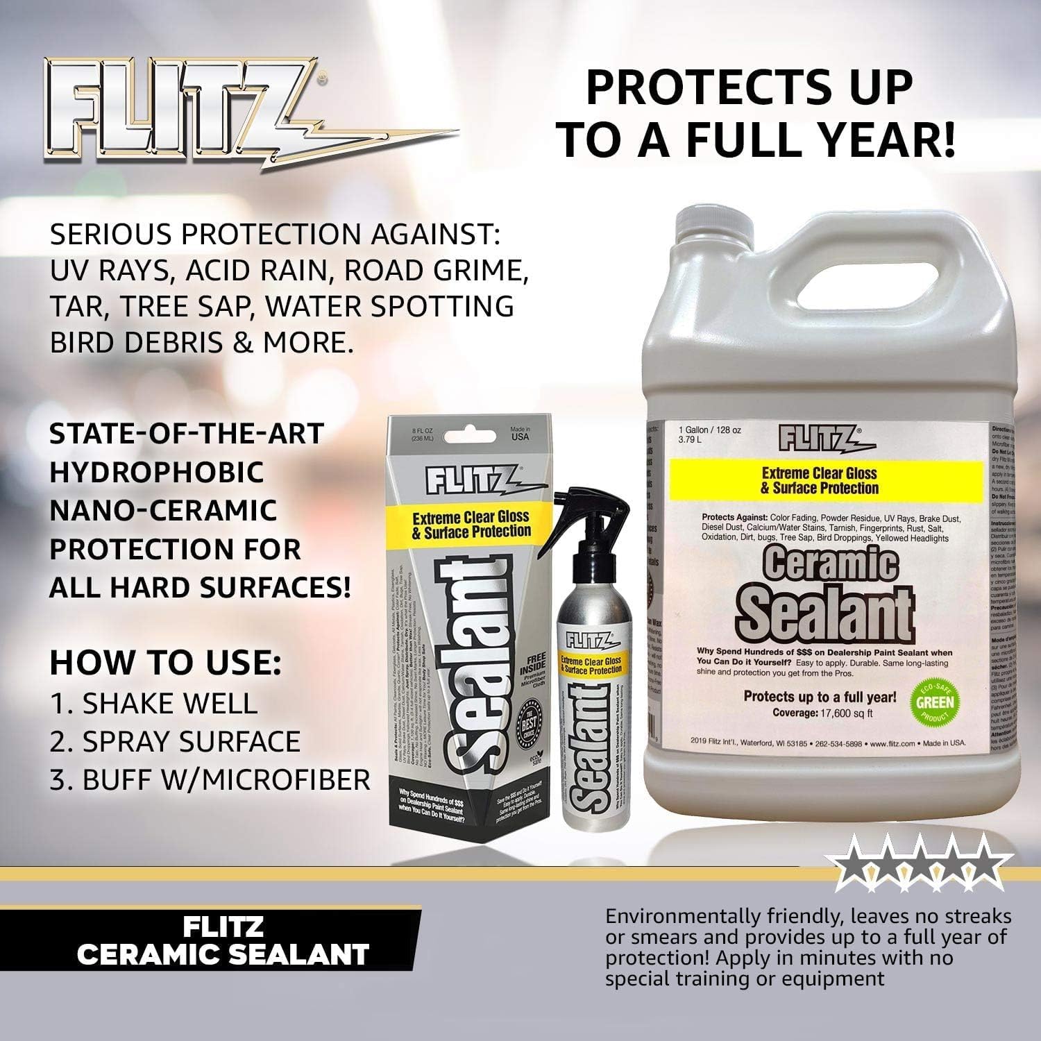 - PRO-GRADE CERAMIC SHIELD - Flitz Ceramic Coating Spray creates a durable barrier against water, dirt, UV rays, and every element in your path. Our ceramic glass coating's buff-off formula easily creates a shield that’s ready for any adventure