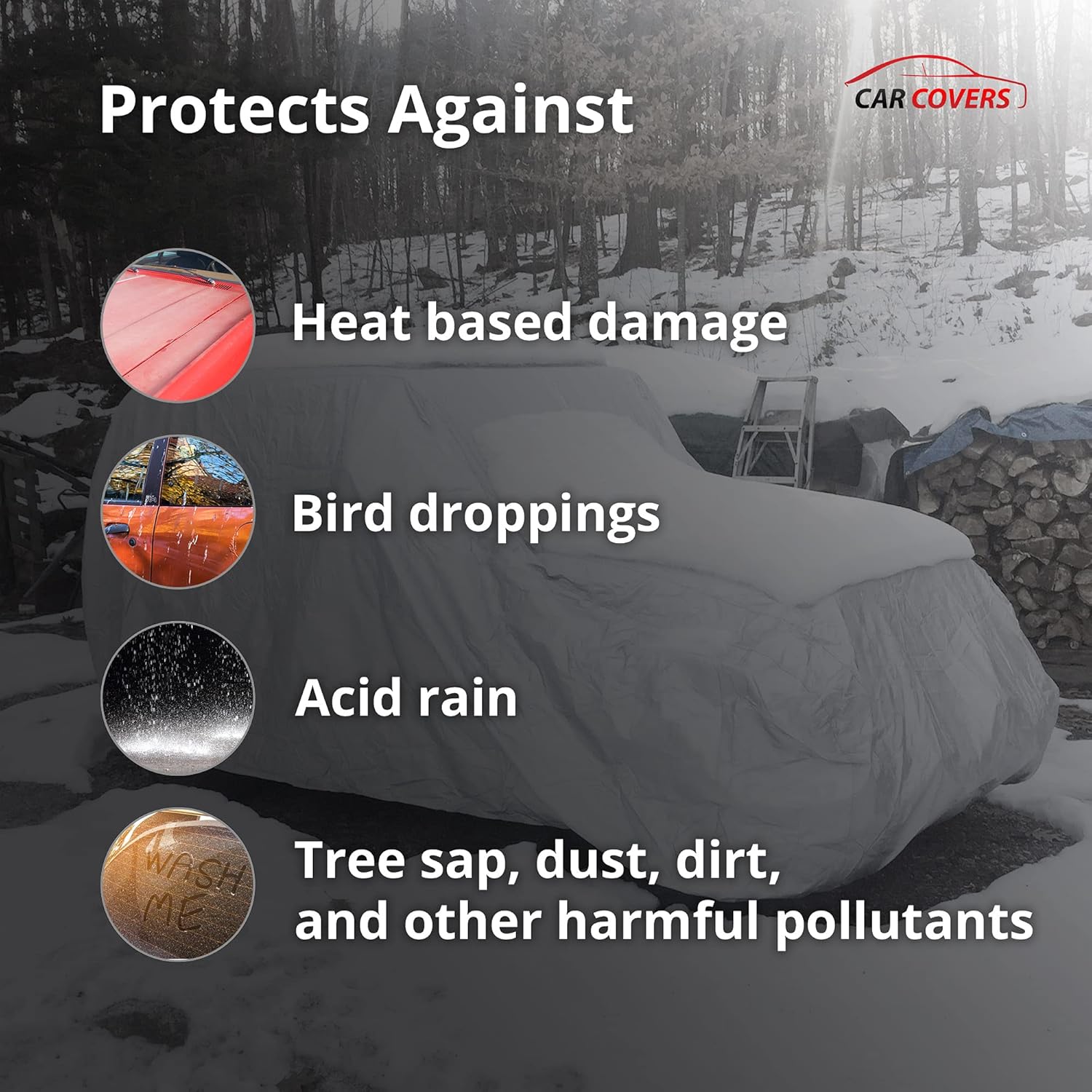 - YEAR-ROUND PROTECTION PREVENTS DAMAGE: Specially made full exterior covers for all indoor and outdoor elements, our top-quality multi-layer car covers feature breathable interior fabric with double stitched, welded, and reinforced seams and an ultra soft fleece inner lining to protect paint and to ensure your vehicle’s surface finish stays in pristine condition.