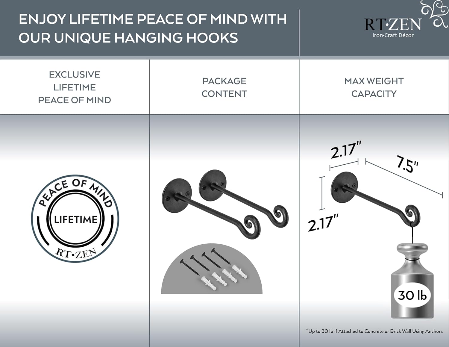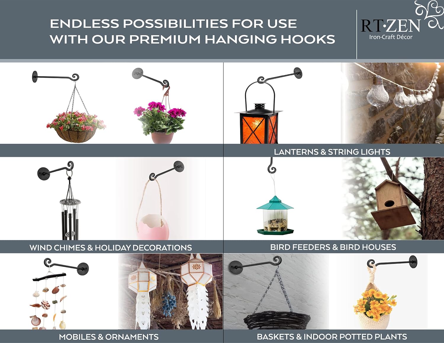 RTZEN Plant Hangers Outdoor or Indoor - Wrought Iron Metal Hanger Indoor Hook - Heavy Duty Wall Bracket Hooks for Hanging Plants Baskets Lanterns Wind Chimes - 2 Pack (Black Swirl Hooks)