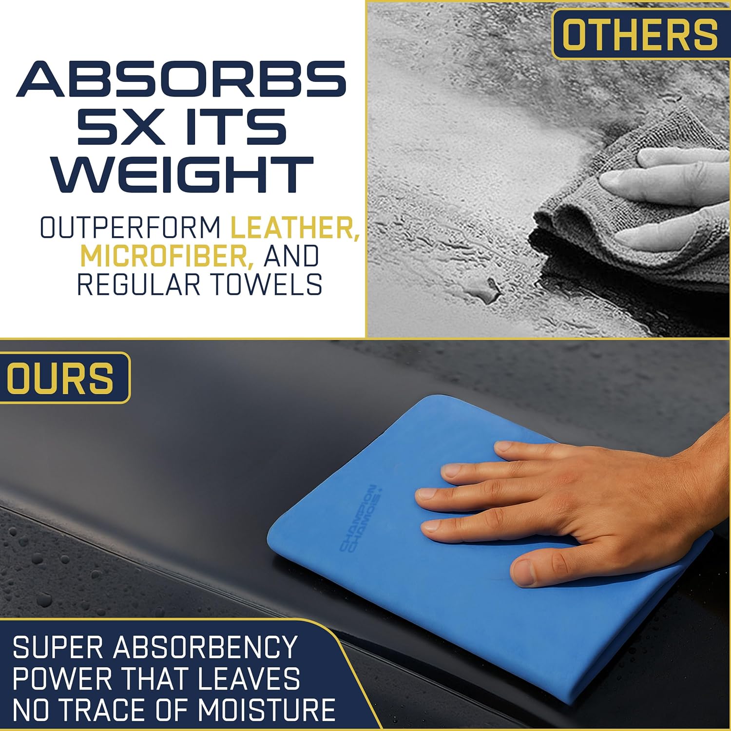 - SUPERIOR ABSORBENCY - Champion Chamois UltraAbsorb+ cloths soak up liquids like no other, making them ideal for car care and spills. With up to 50% more absorbency than competitors and 300% more than microfiber towels, our chamois is a game-changer.
