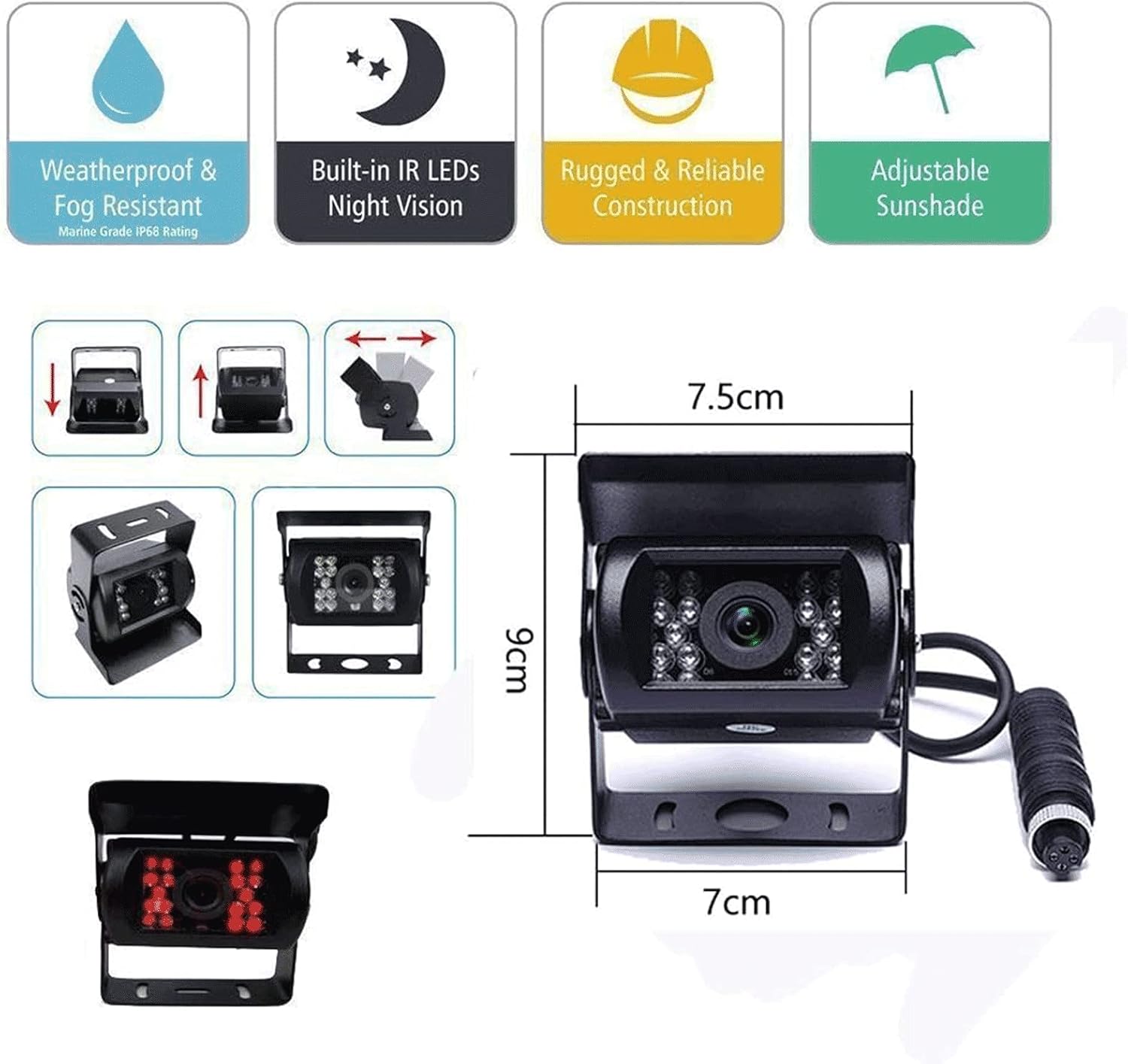 - 【IP68 Waterproof RV Backup Camera (No Guide Lines)】Hard Metal Cased Camera, waterproof and Mud proof. 18 IR LEDs for Night Vision + 120° horizontal wide view angle + 180°vertical adjustable angle to view the blind spots. You can get it work Full Time when connect to constant power source