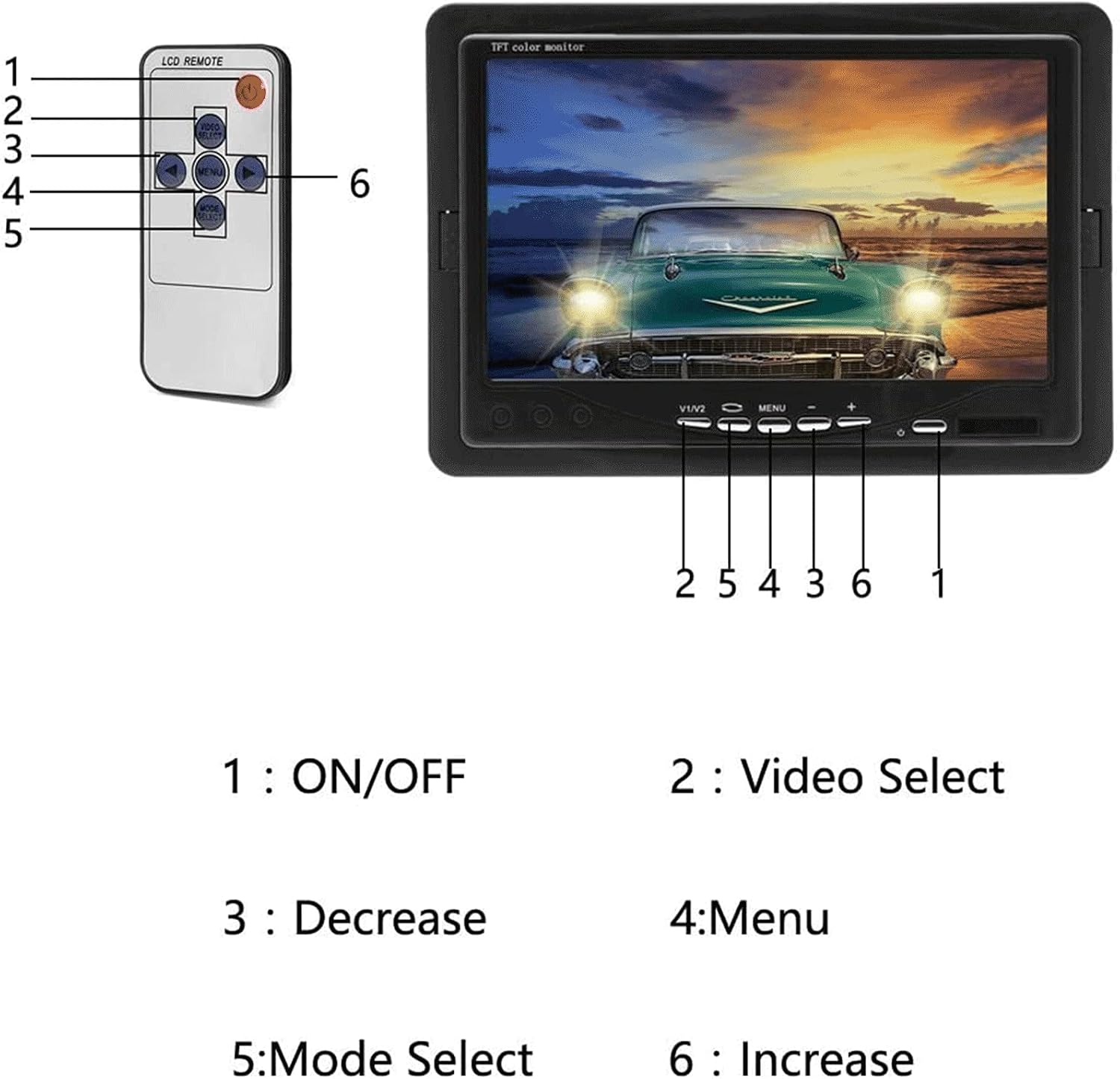 - 【7-inch Screen Car Rear view Monitor】2-channel video input, high resolution image, full color display and low power consumption, adjustable brightness, contrast and color. Image can be rotated horizontally and vertically for mirror or normal viewing