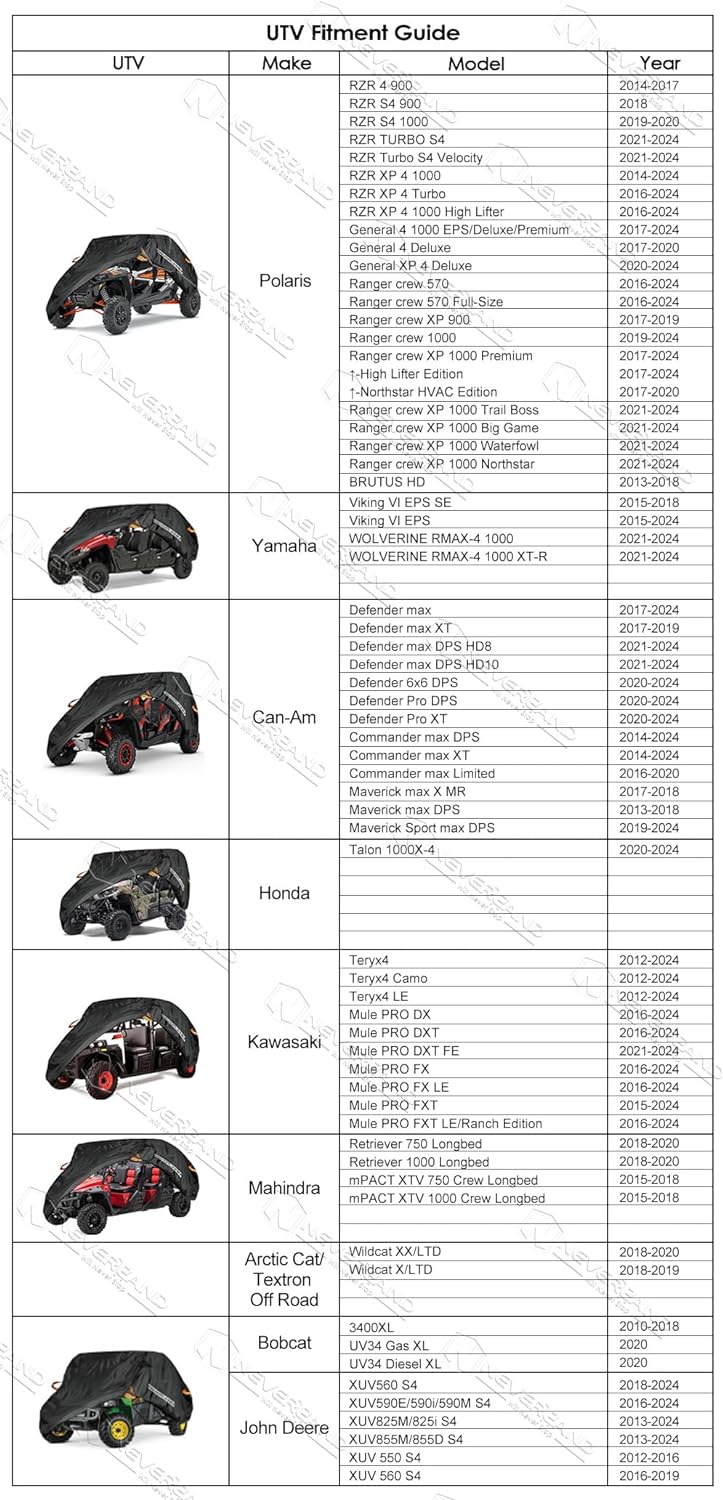 - [Fits Most 4-6 Seats]: You can refer to the compatibility table given on the chart, our covers are compatible with polaris, rzr, yamaha, can-Am defender, kawasaki mule ranger etc. Up to 157" in length, please check UTV sizes carefully before purchasing