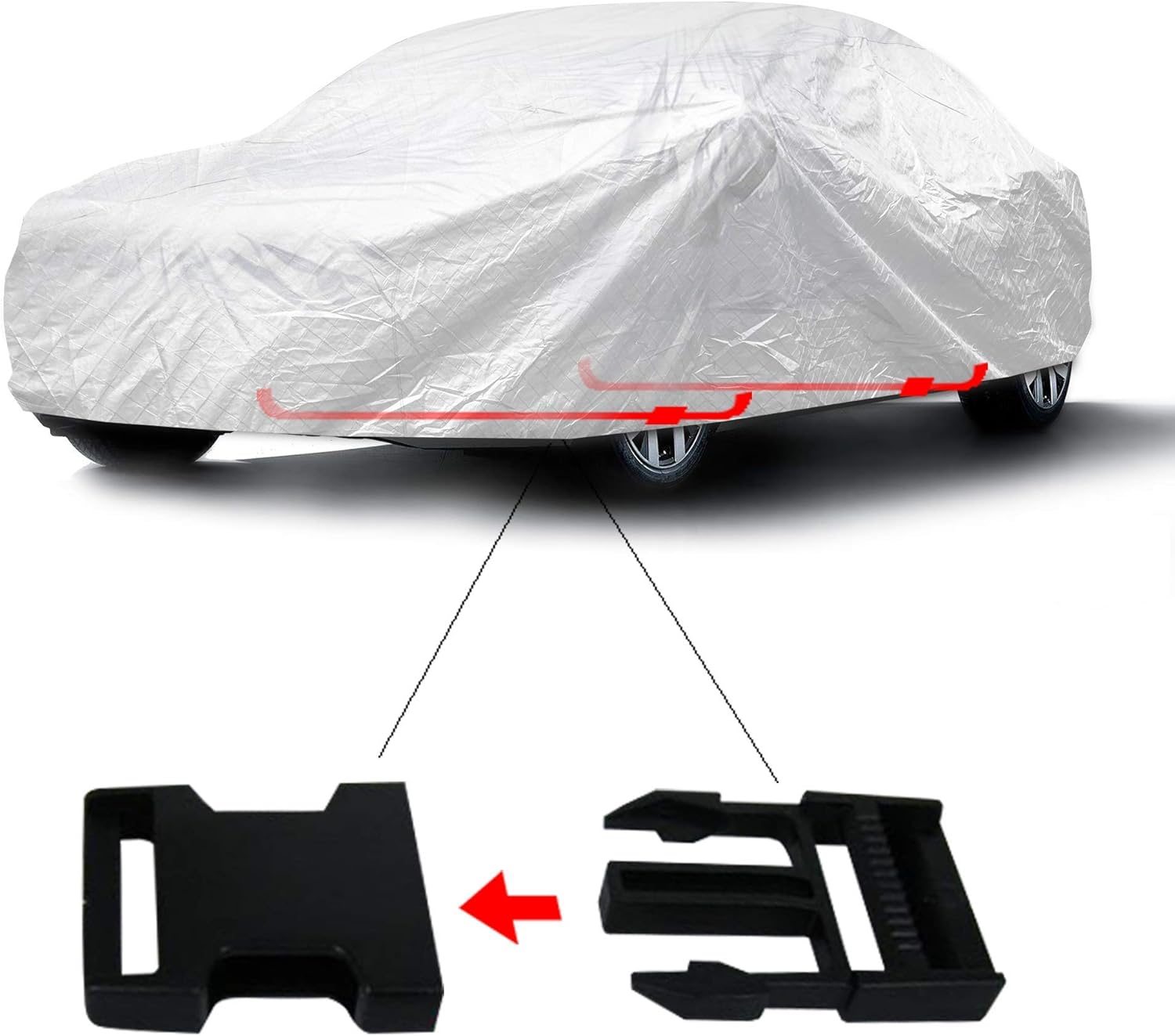 - 【SNUG SECURE DESIGN 】Easy to put on and take off, snug buckle clips at the front and back tiresto keep your car cover in place and to keep heavy wind from blowing it off. Measures 177"-215" inches. Will easily fit all smaller vehicles such as sedans, hatchbacks.