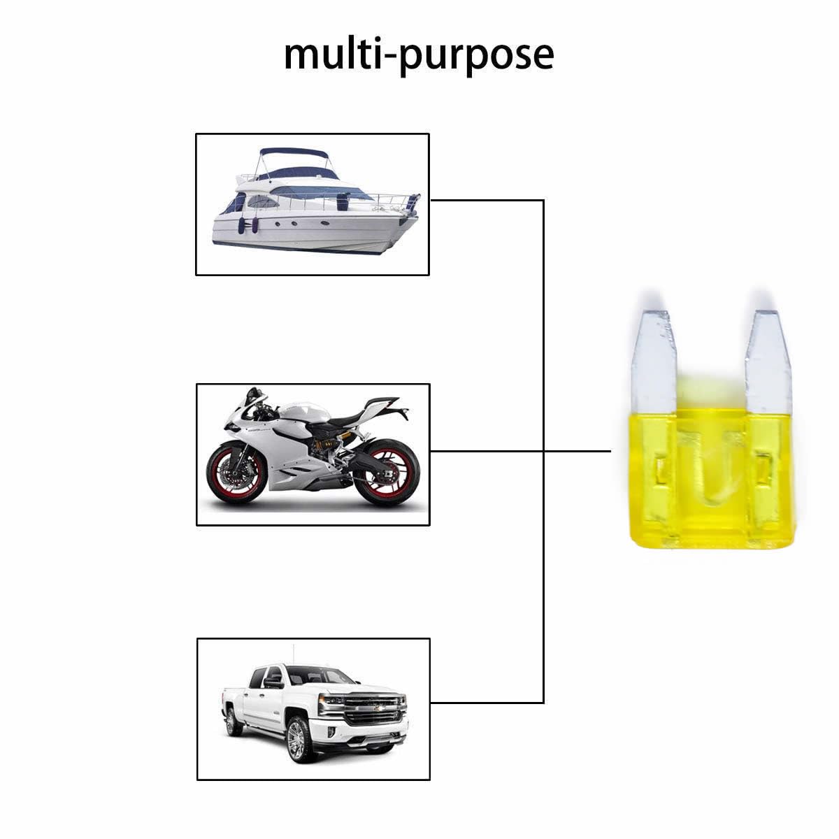 - WIDELY USE - These assorted fuses are specifically designed for Cars, Trucks, SUVs, ATVs, UTVs, Camper RV, Motorcycles, Fleet, Golf Car, Boat, snowmobiles, and most general DC applications etc., covering such components as radio, light, turn signals, etc.