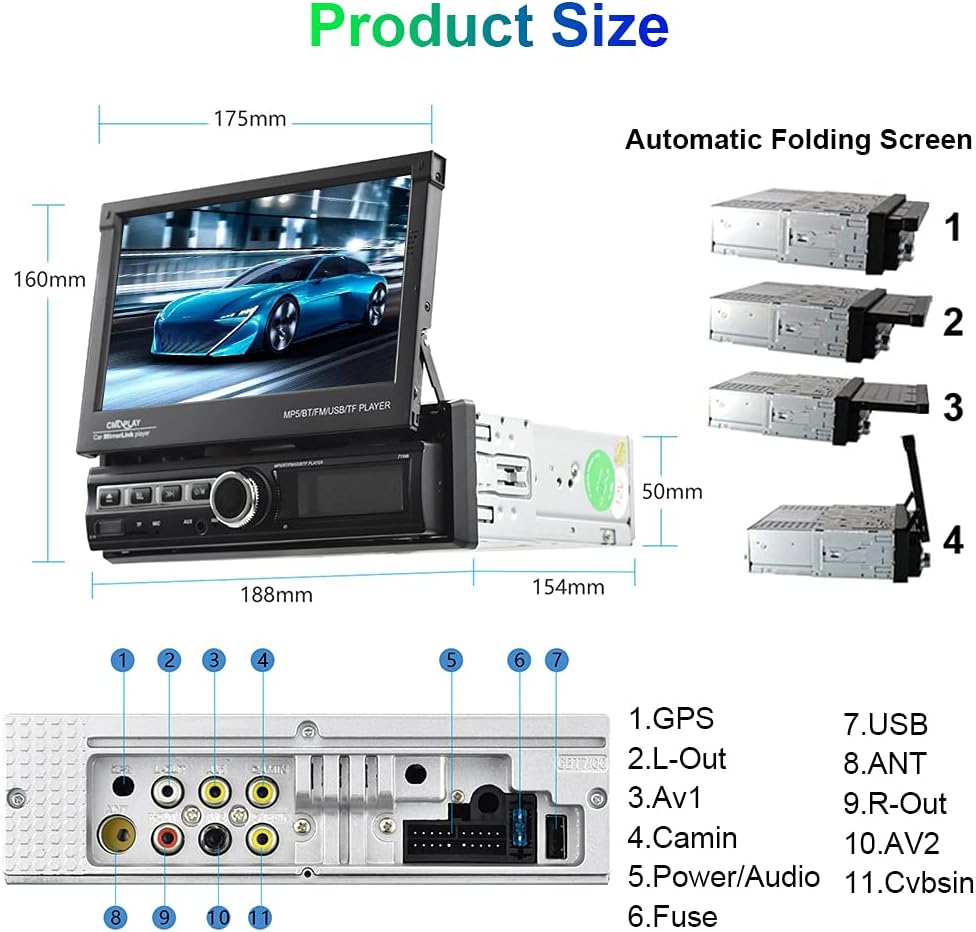 - 🚘【Automatic Flip Out Touch Screen】This 7” touch screen car stereo supports support 1080P video playback. Seven-color key backlights adjustable. With wireless IR remote control, convenient to use and safe to drive. With USB/AUX-in/SD card ports. RCA output/input port.