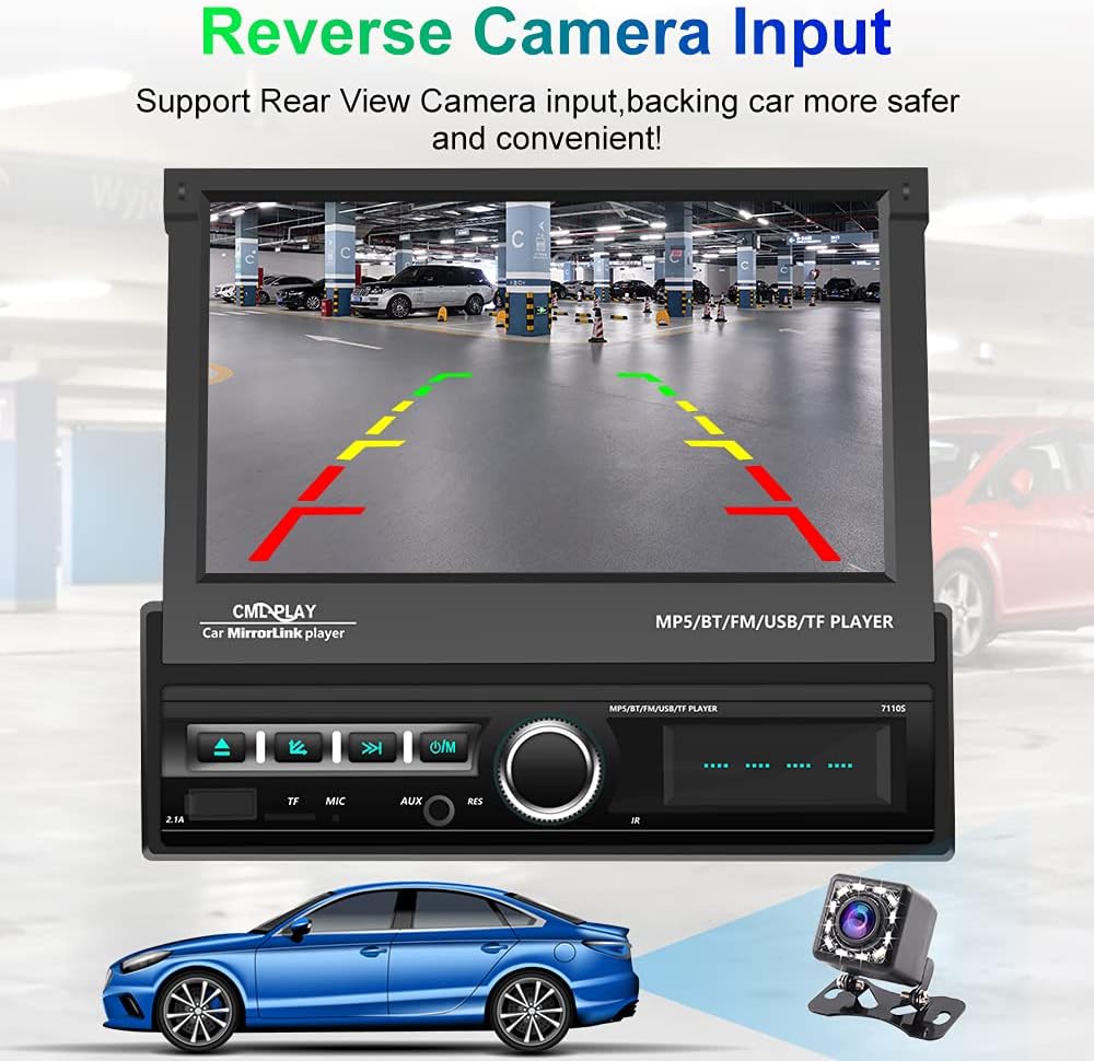 - 🚘【Front & Rear View Camera Input】This Retractable screen car stereo equipped with a rear-view camera, after successfully connected to the car, the single din touchscreen car radio will automatically display the super HD reverse video once you put the car into reverse gear, helps your park and reverse safer and easier.