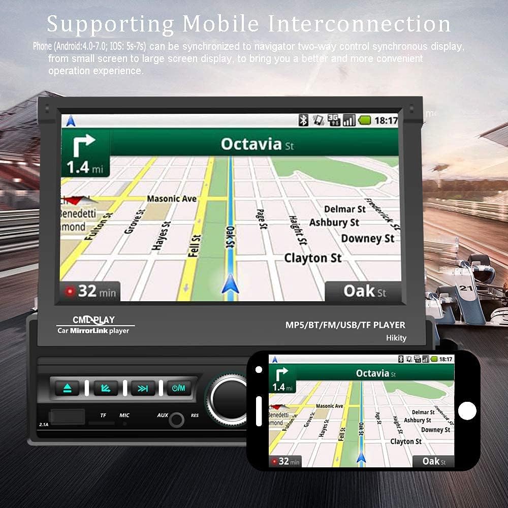 - 🚘【Wired Android/IOS Phone Mirror Link】Single din flip up screen radio supports Android two-way connection, IOS one-way projection to the car headunit. You can watch the video on the Bluetooth car stereo after connection. You can cast all the functions which you want on your phone to this audio's screen, making your drive more convenient and interesting.