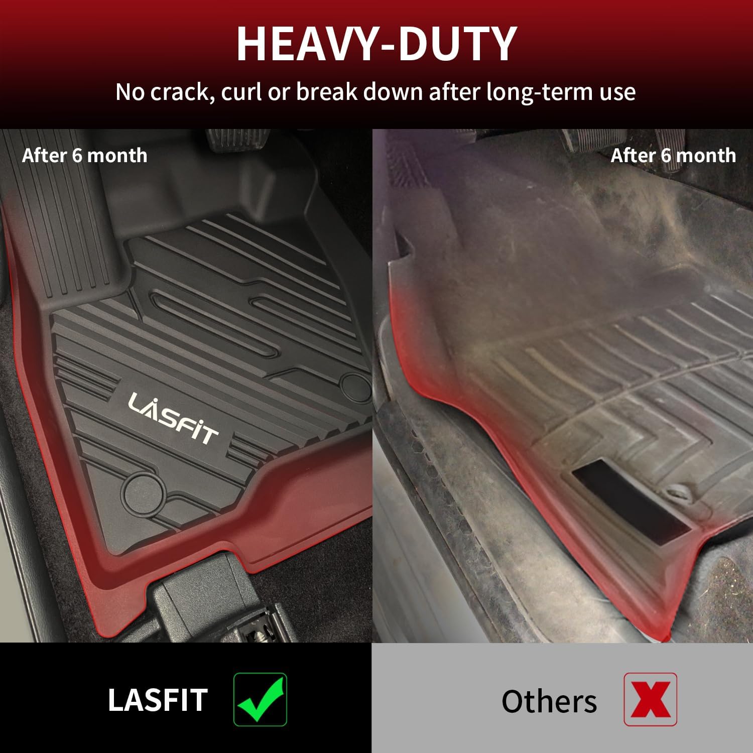 - FIRM YET FLEXIBLE - LASFIT Edge Mats Raised edges all the way around have been upgraded to the use of innovative material, allowing our floor liners last long, way more durable that they won't curl or end up buckling.