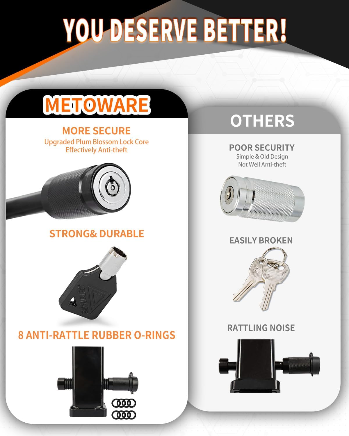 - HEAVY DUTY TRAILER HITCH PIN LOCK – It’s a newly upgraded trailer hitch receiver lock with all metal construction. Two tubular keys are included to ensure easy fit and detach.