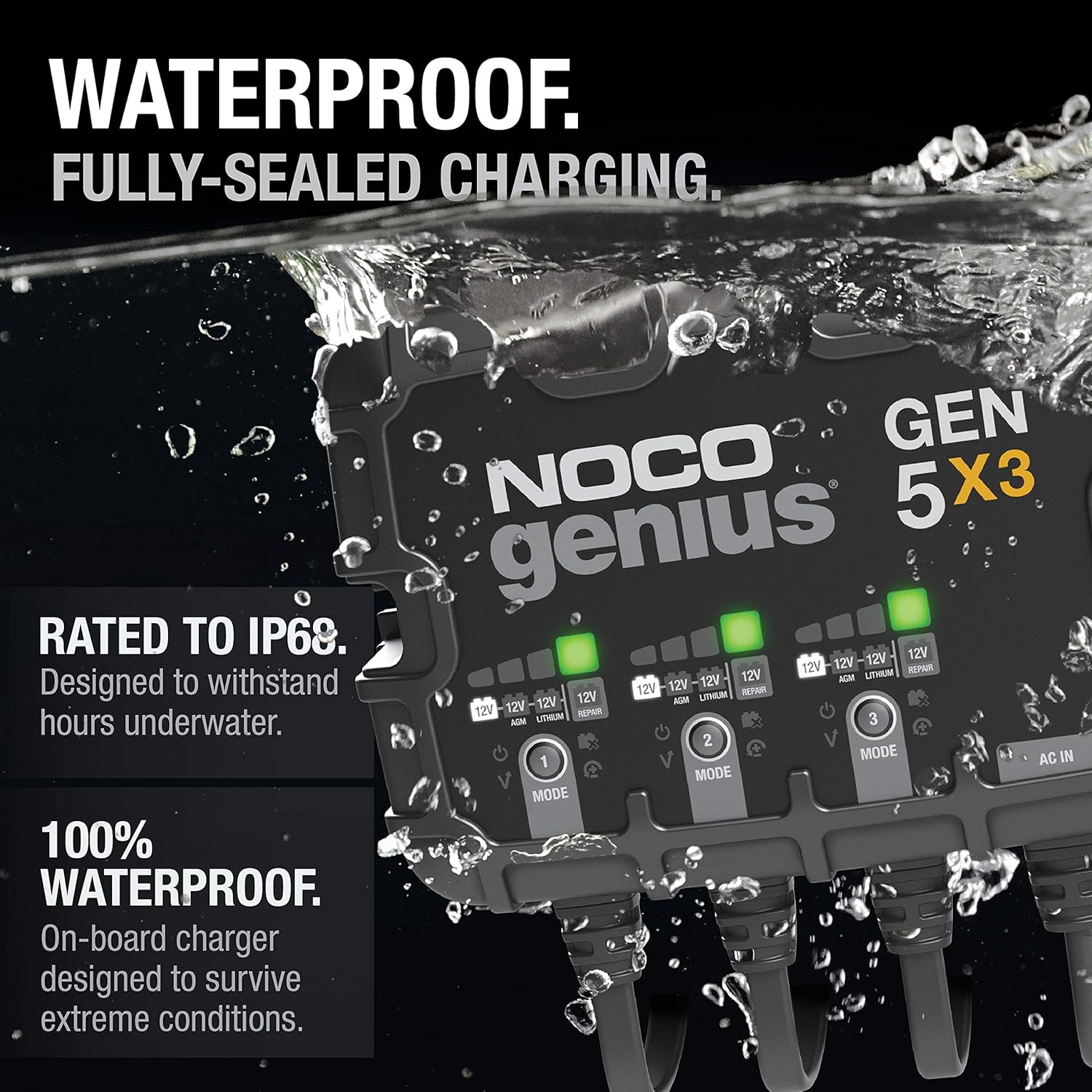 - DESIGNED FOR WATER — A fully-sealed onboard charger rated IP68 for waterproof protection. Survives brutal life cycle testing, including thousands of hours underwater in the harshest marine conditions.