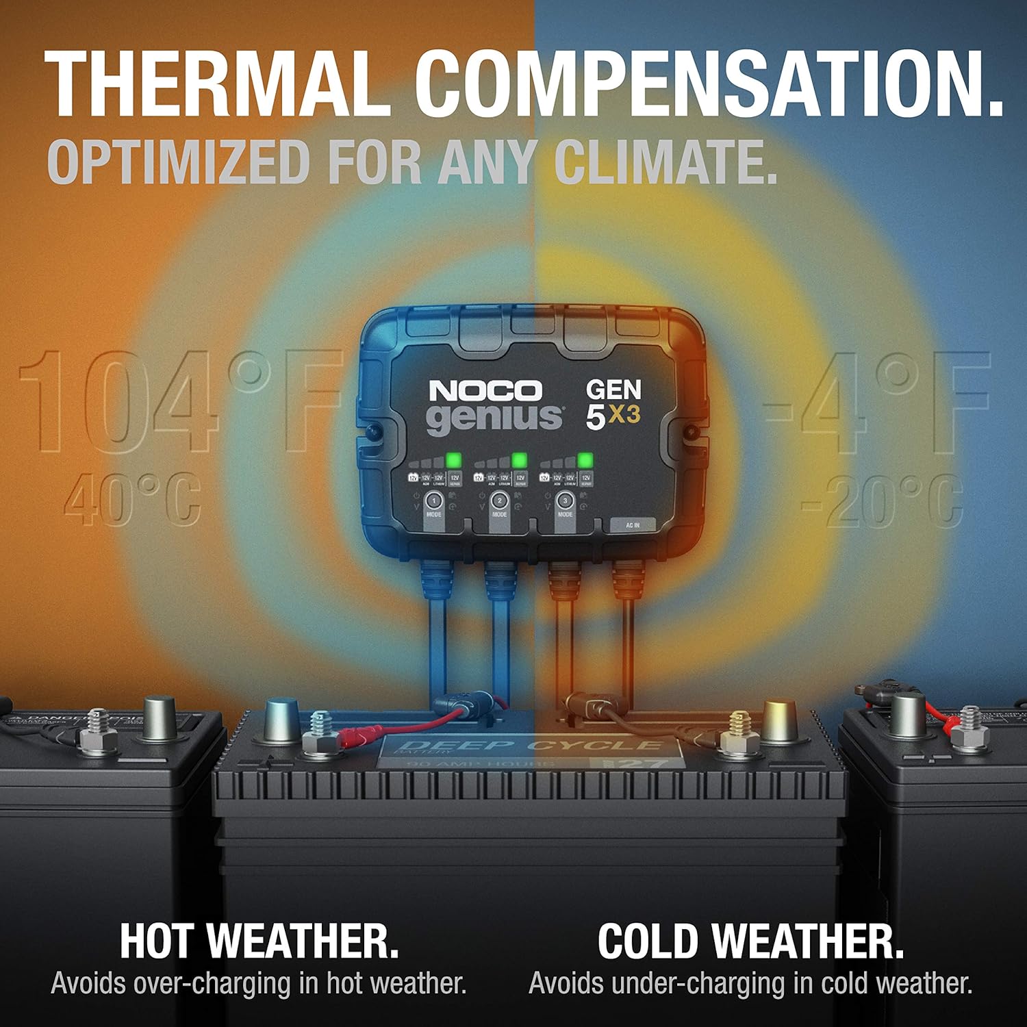 - ENJOY PRECISION CHARGING — An integrated thermal sensor adjusts charging based on ambient temperature, preventing overcharging in heat and undercharging in cold for optimal battery performance.