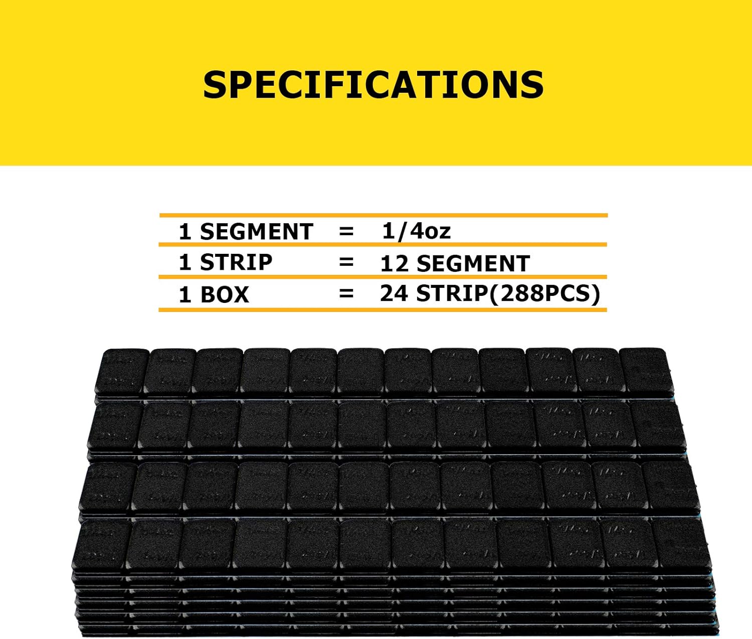 - Specification: Black 1/4 oz segments. 12 segments per strip. 24 strips per box. Total weight = 72 oz (4.5 lbs), enough to meet your daily use and replacement needs. Our tire weights are crafted from non-lead materials, universal for 50 states