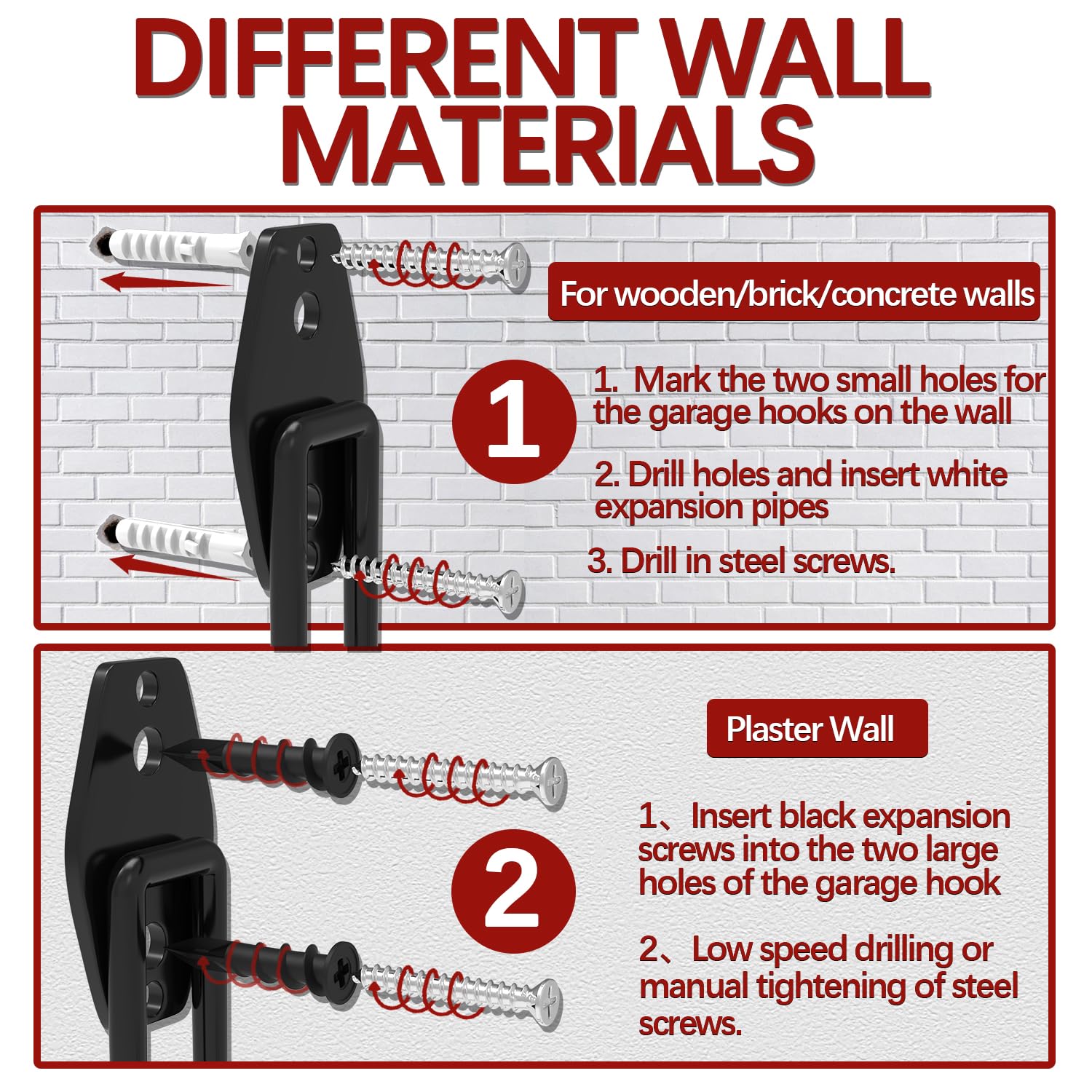 - Easy To Install: These garage hanging hooks are suitable for various walls. You can install them effortlessly. For plaster walls: (1) Insert black expansion screws into the two large holes of the heavy duty garage hooks; (2) Low speed drilling or manual tightening of steel screws. For wooden/brick/concrete walls: (1) Mark the two small holes for the garage hangers on the wall; (2) Drill holes and insert white expansion pipes; (3) Drill in steel screws