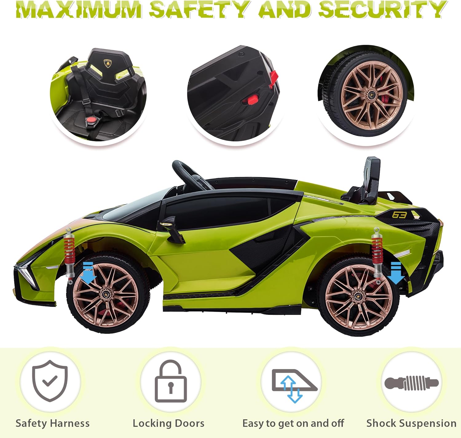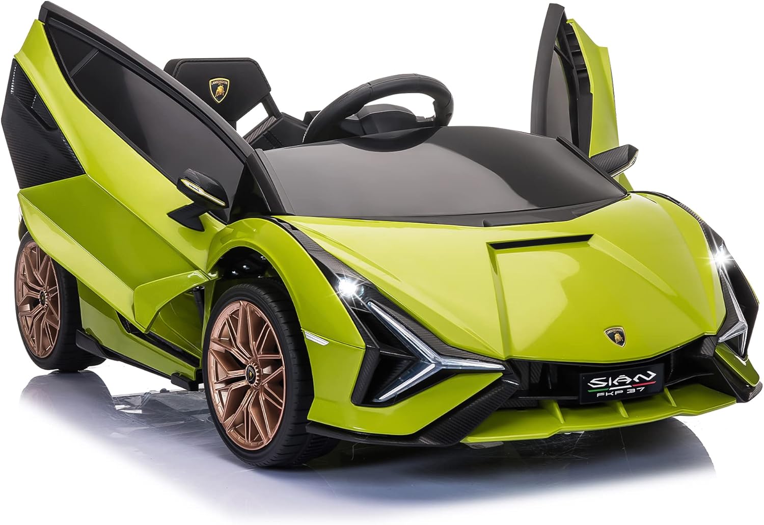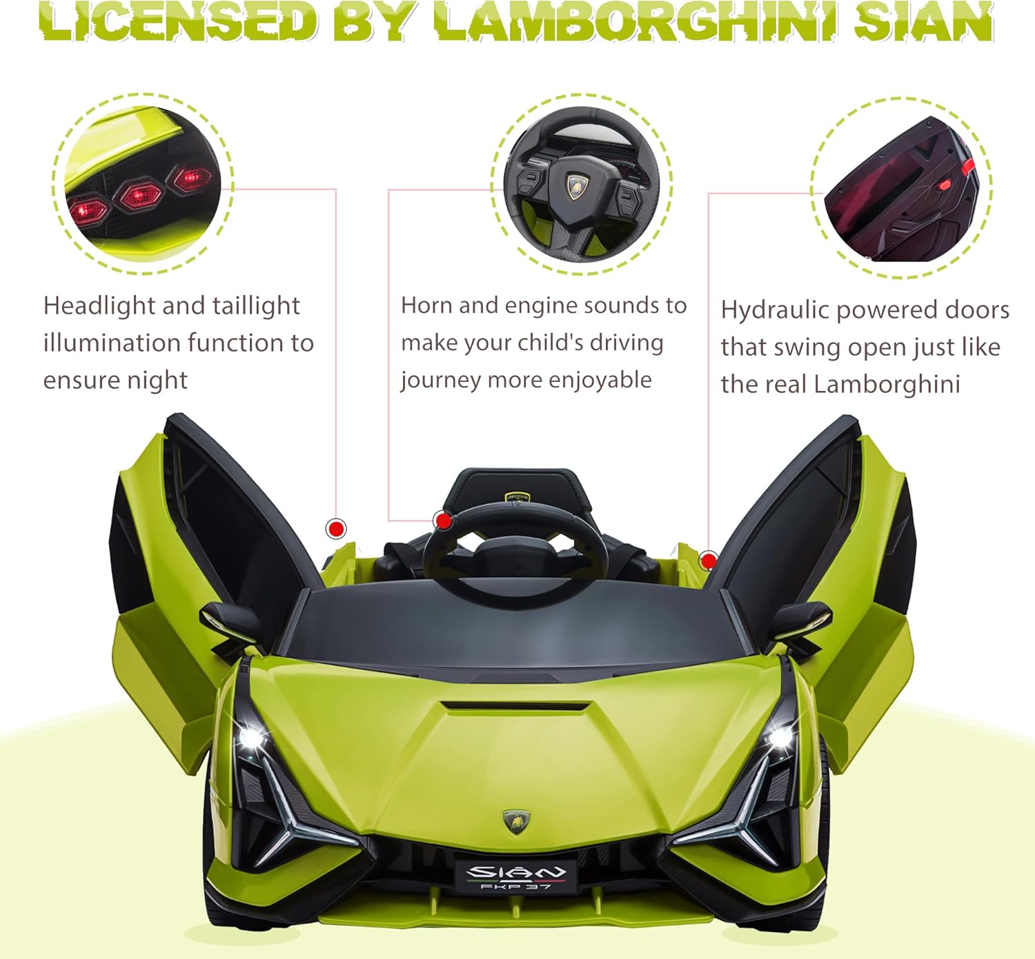 - REALISTIC DRIVING EXPERIENCE: This Officially Licensed Lamborghini Sian ride-on car comes with LED headlights, a horn and realistic engine sounds. The hydraulic-powered doors add to the authentic design, providing a realistic driving experience for your child.