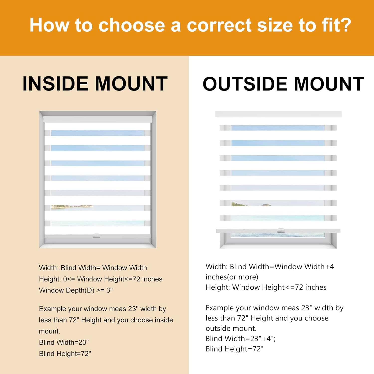 - 【How to choose a correct size to fit? Example your window meas 23" width x less than 72" Height.】INSIDE MOUNT: Window Width is Blind width. Blind Width=23"; Blind Height=72". OUTSIDE MOUNT: Plus at least 4" is blind width, Blind Width=23"+4"=27"; Blind Height=72".【Pls Note】Fabric width will be 0.8" narrower than the size of the blind.