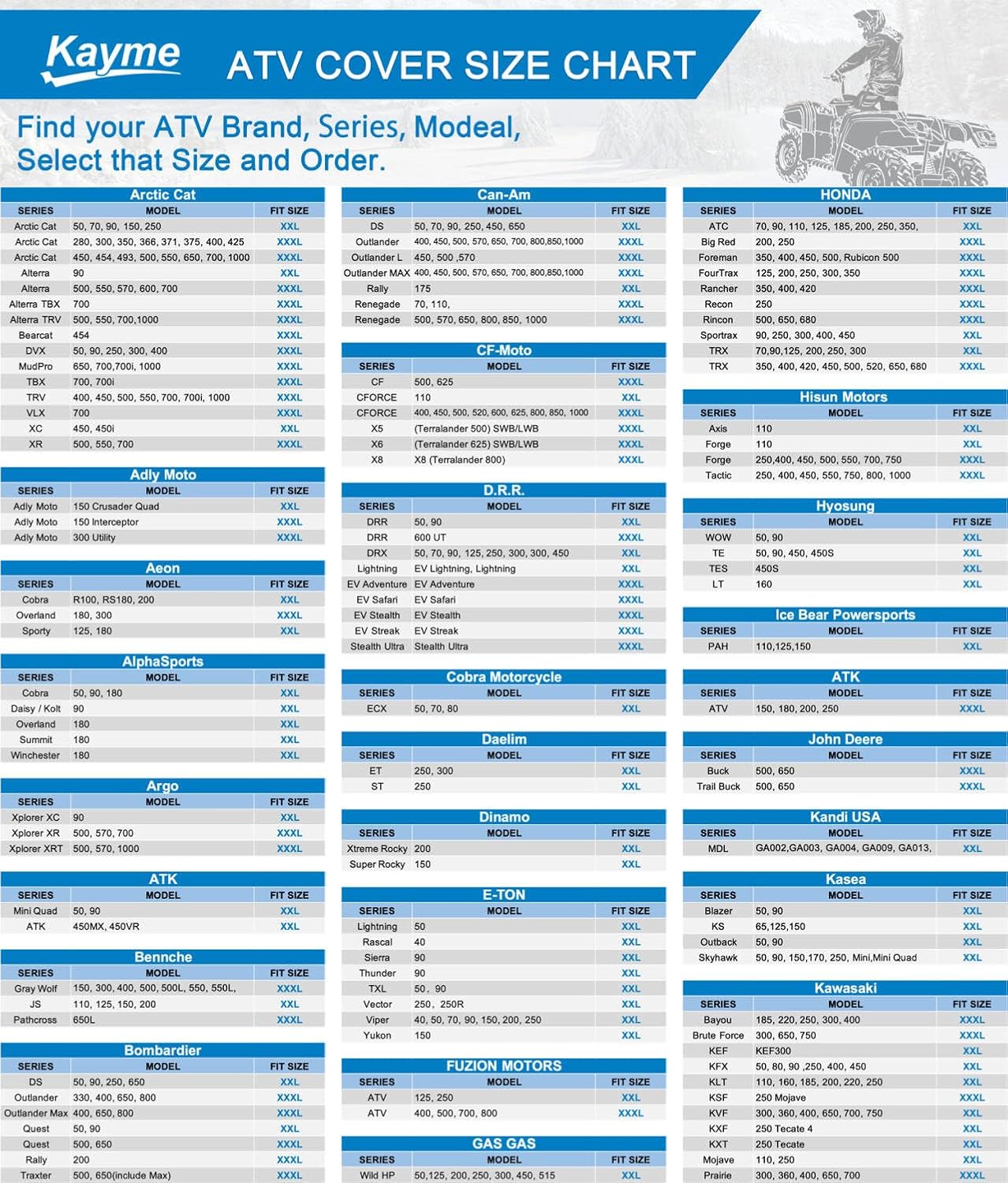 - 【Extreme weather protection】Kayme waterproof outdoor storage ATV cover to protect your large ATV from harmful UV rays, dust, snow, rain, industrial pollutants and bird droppings.