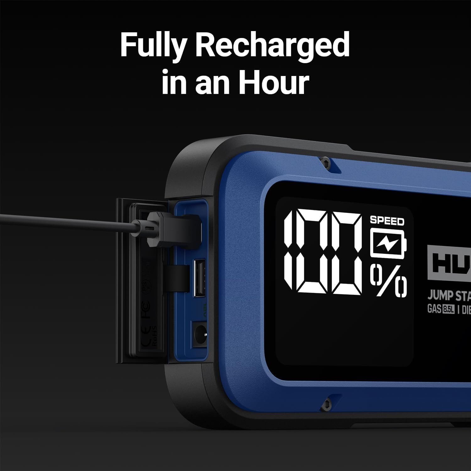 - [0% to 80% in Just 1 Hour]: With our advanced 65W Speed Charge Tech, this car battery jump starter recharges from 0% to 80% in just one hour and fully charges in 90 minutes. Once fully charged, it can hold power for up to 18 months. A quick 5-minute charge is enough for one emergency jump-start.