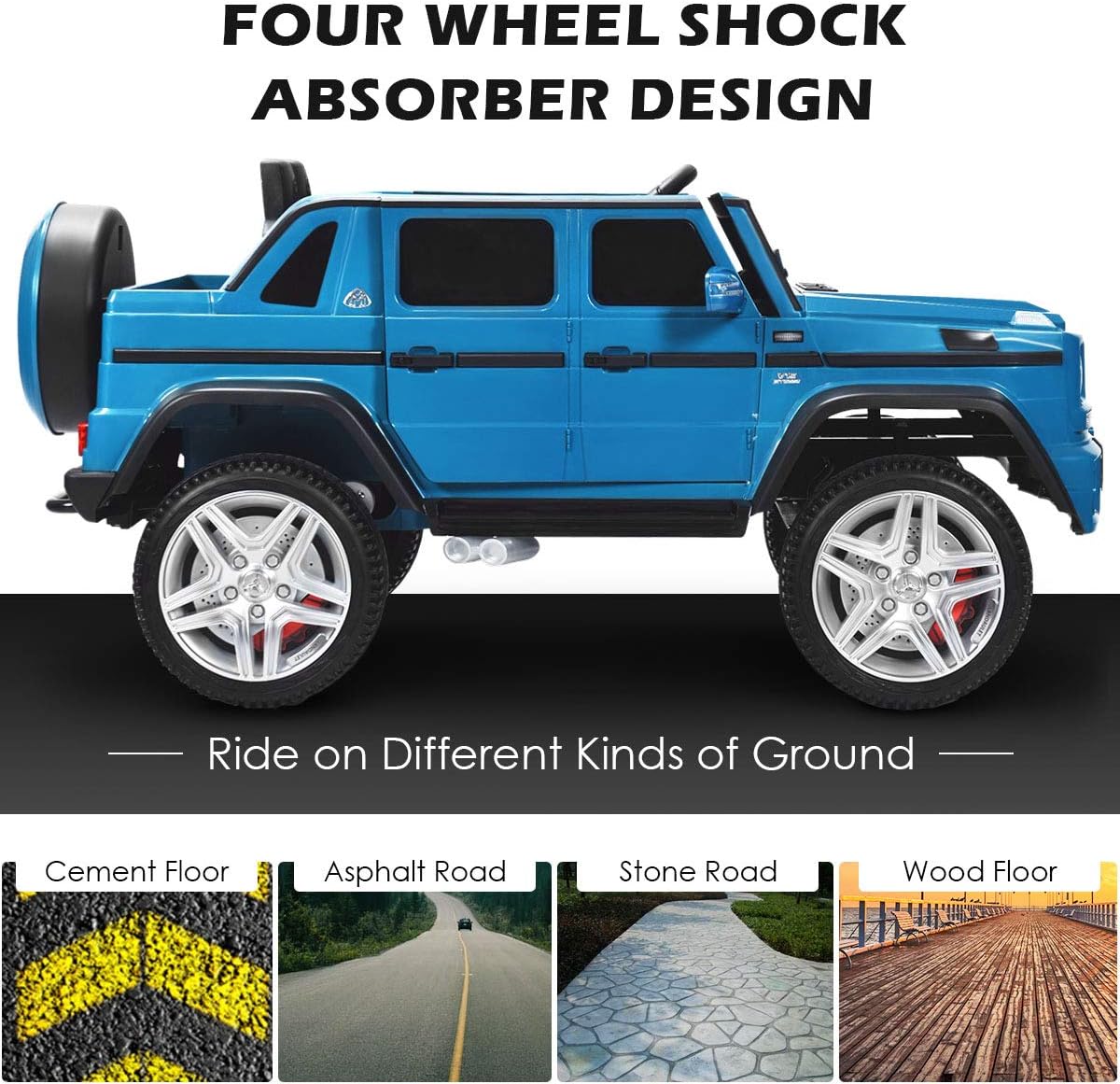 - 【Slow Start & Spring Suspension】The slow start function can avoid the danger of sudden acceleration, and the spacious seat is equipped with seat belts to ensure the safety of children. 4 wear-resistant PP wheels with spring suspension system are suitable for all kinds of roads, including asphalt roads, brick roads and cement roads.