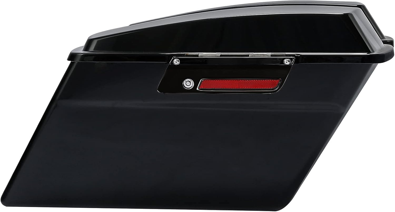 - Material: Made of durable ABS plastic, Vivid Black finish, strong and practical; Left & right stock style lids, fit the saddlebags perfectly and waterproof