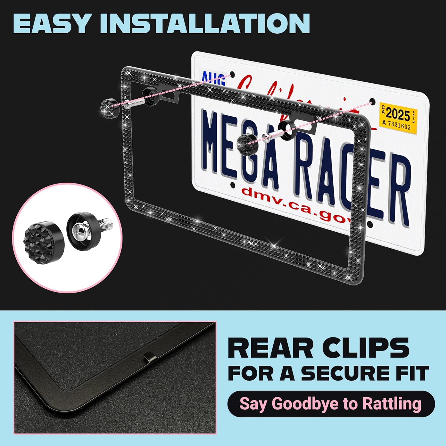 - Black Rhinestone Bling License Plate Frame for Women: Add a girly, glittery touch to your ride with this stunning 1-pack that’s made to shine.