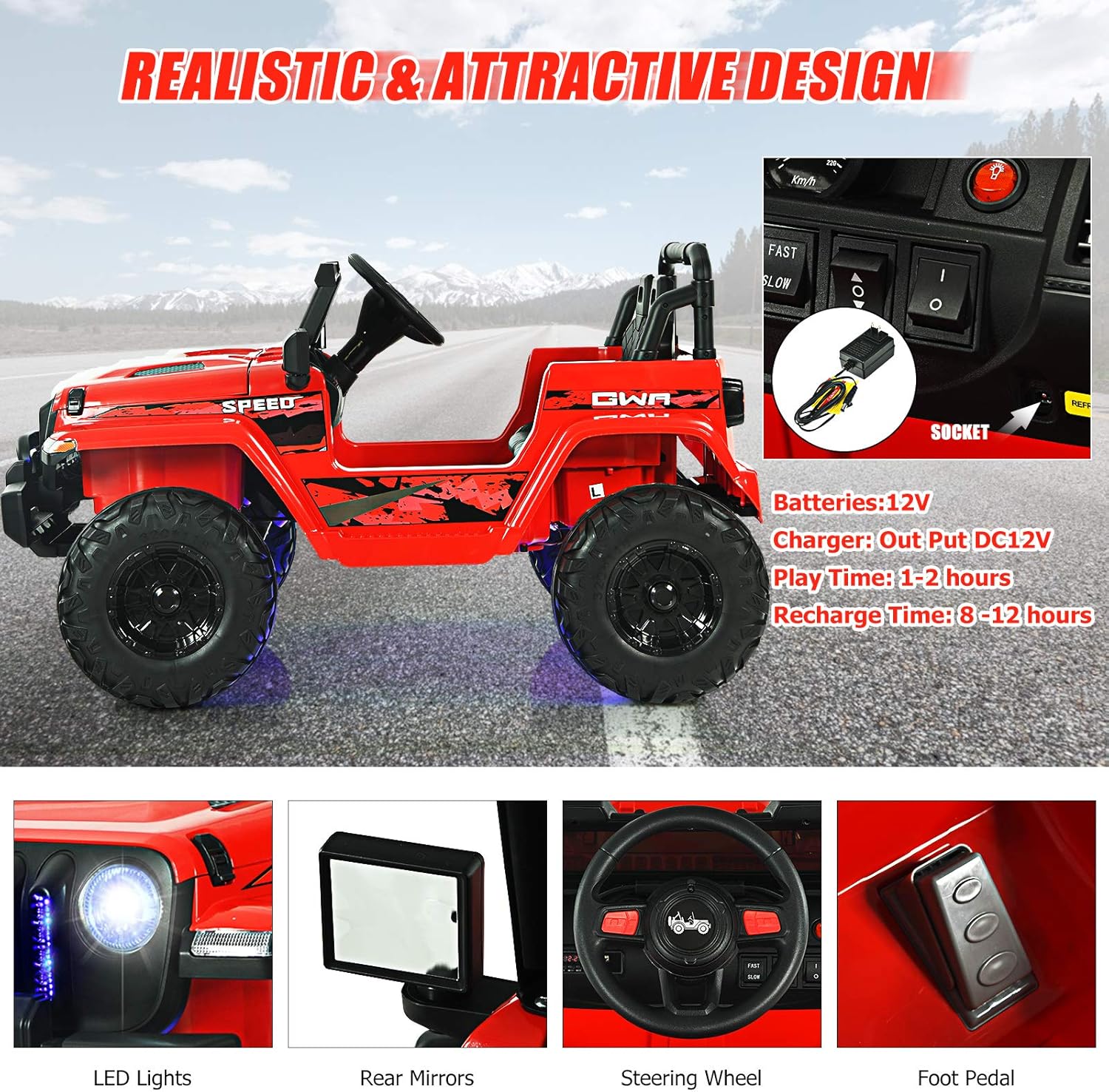 - REALISTIC DRIVING EXPERIENCE: Your kids can simply accelerate, decelerate or brake by operating the realistic non-slip foot pedal. Designed for small hands, the steering wheel has rounded edges and a comfortable grip, complete with horn and engine sound buttons. And the windshield and rearview mirror also greatly increase the sense of reality. The stylish body of the ride on jeep car is made of safe and high quality material, which is firm and durable. No child will refuse this perfect gift.