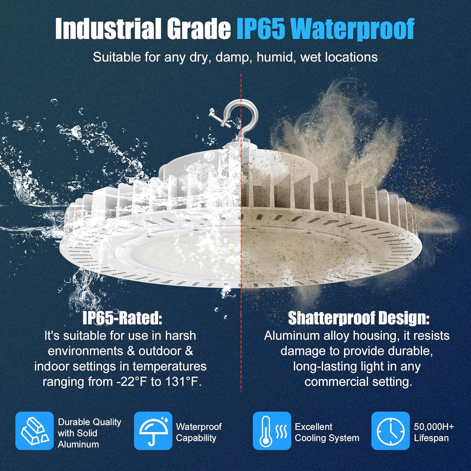 - 【High Brightness & Bill Saving】Saving up to 80%-150W energy-saving UFO led high bay shop light fixture at 5000K daylight provides 21,000lumens, up to 150 lumens per watt, equivalent to 650W MH/HPS, and high bay lights can instantly reduce electricity bills by 80%.