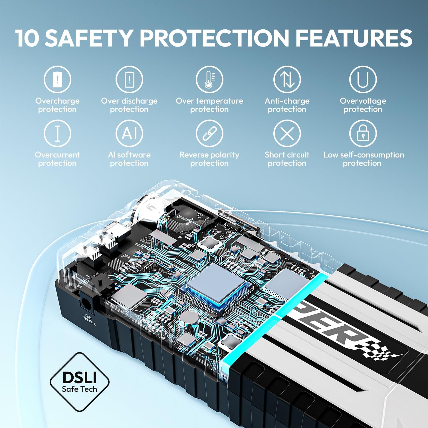 - DSLI IV INTELLIGENT CONTROL TECHNOLOGY - YESPER YJS40 car jumper starter portable. Compared with the previous generation technology, the reassembly of the DSLI IV structure and microcomputer control program increases the voltage by 30% to 14.8V, and the starting current peak value is up to 4120A, achieving 1 second car start. The powerful intelligent temperature control technology reduces the starting temperature, helping you start faster, stronger and safer