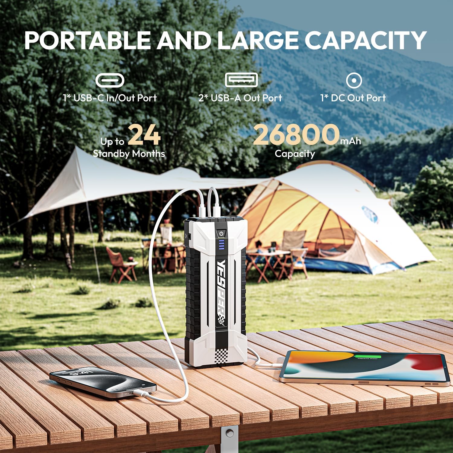- 26800mAh BATTERY CAPACITY - Our YJS40 portable car jump starter has a true capacity of 26800mAh(99.16WH). Jump pack for car battery built-in USB(5V/2.4A), USB QC(5/9/12V) and Type-C(5V/3A) in/output ports. and a DC(15V/10A) port to power any DC devices, like a tire inflator, car vacuum cleaner, car refrigerator