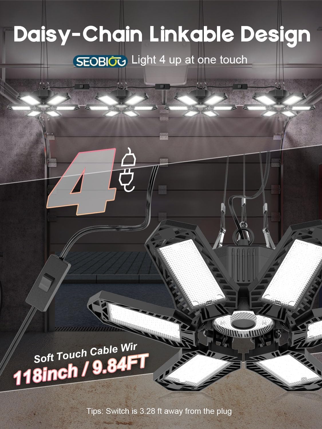 - Linkable LED Shop Light: Each garage LED light comes with 9.84ft of power cord, which can seamlessly link up to 4 garage lights together and control multiple lights with a single switch. The shop light is equipped with hanging wire rope, which can be freely retracted from 0-3.28ft, and it is easy to install, plug-in and play