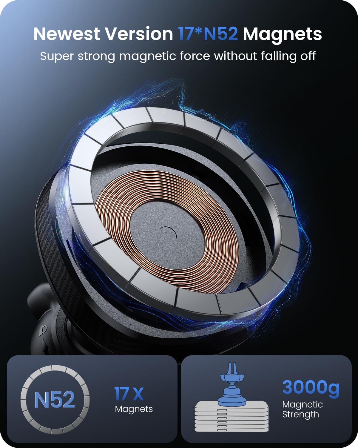 - 【Updated 17 x N52 Strong Magnets】Built-in powerful 17 x N52 magnets ring will firmly suction up your phone, ensuring your iPhone 16/15/14/13/12 stays secure throughout your drive