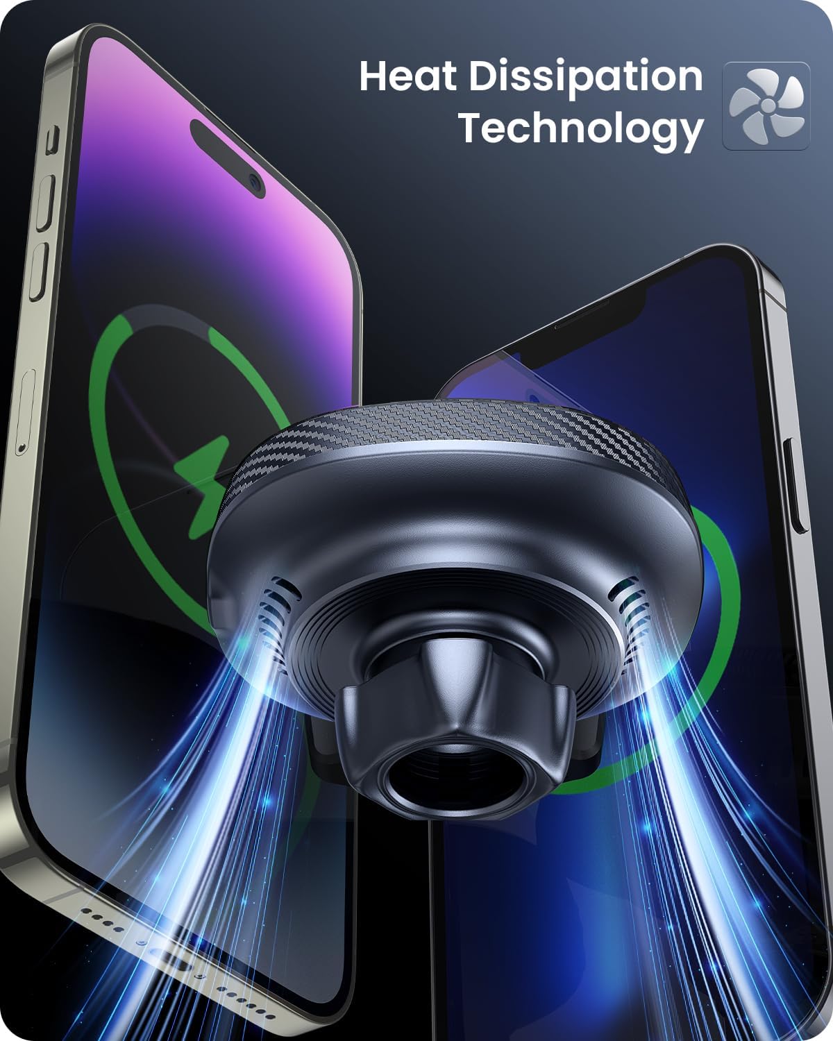 - 【Cooling Fans & 15W Fast Charging】This wireless car charger has built-in phone cooling fans and a heat dissipation system, which provides excellent temperature control during charging. No worry about it getting overheated anymore even if you use this mag safe car charger for a long time, giving your phone better protection. Includes orange/black cable (random color).