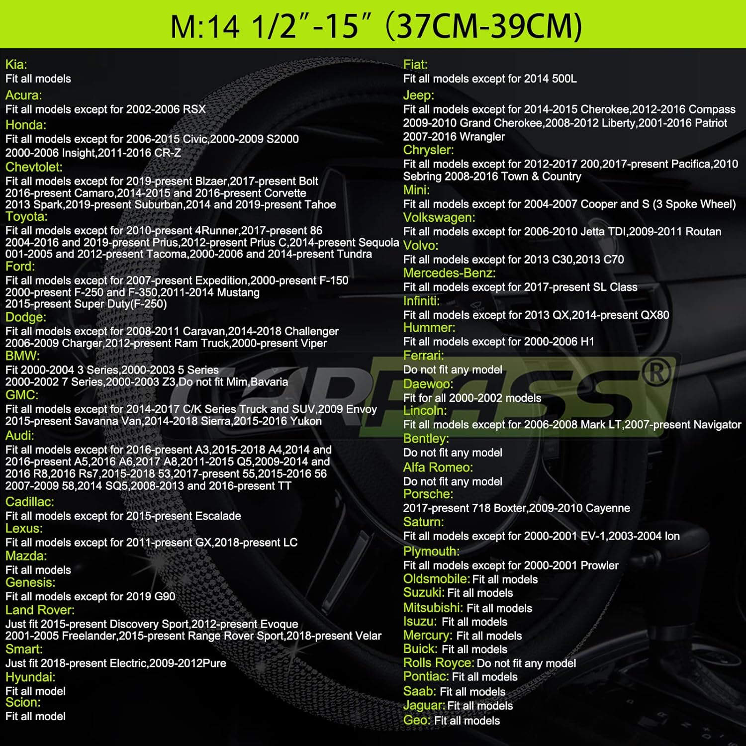- UNIVERSAL FIT:Fits for Standard-size steering wheels with diameter 14 1/2 inch to 15 inch(37cm to 39cm)
