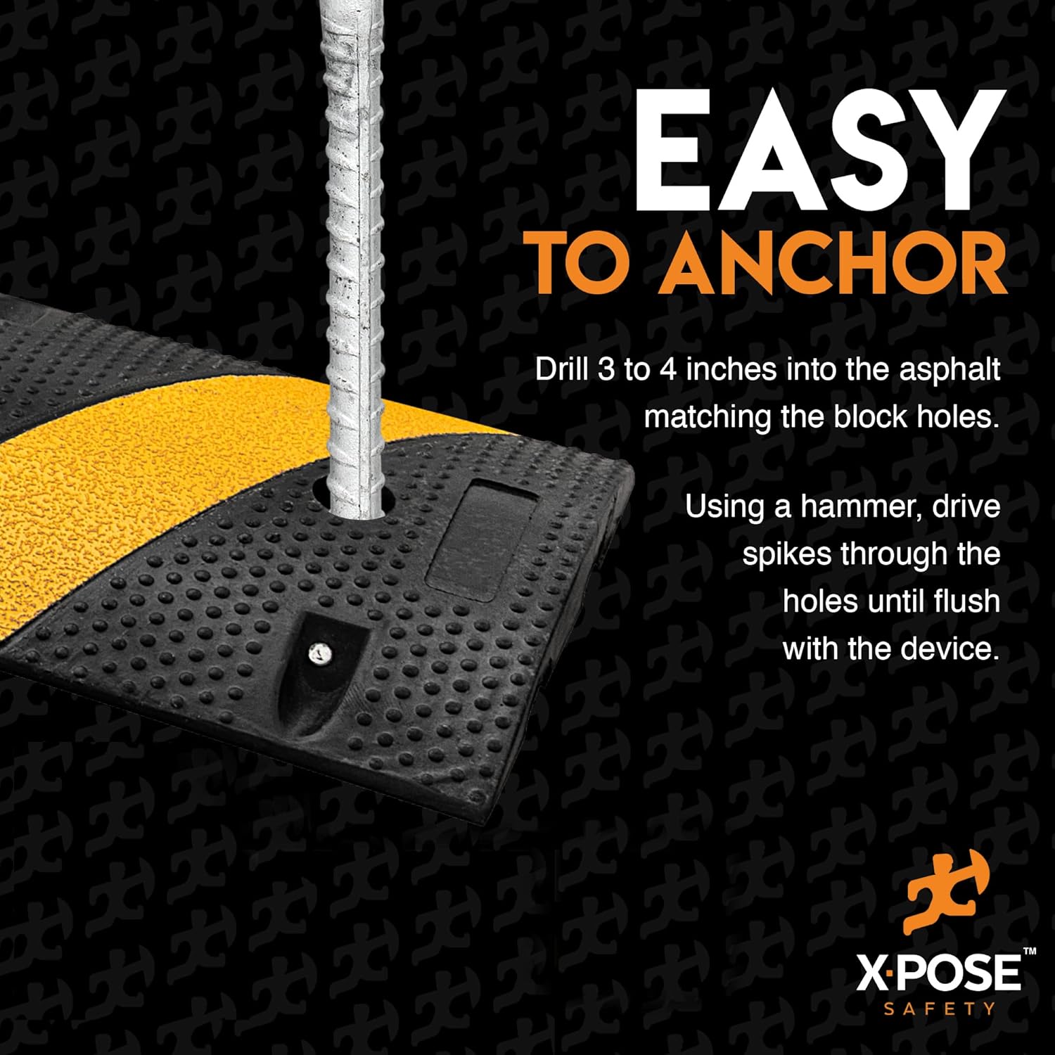 - EASY TO INSTALL - Drill 3 to 4 inches into the asphalt, taking care to match the corresponding holes in the speed bump or parking block. Using a hammer, drive the spikes through the holes until flush with the device.