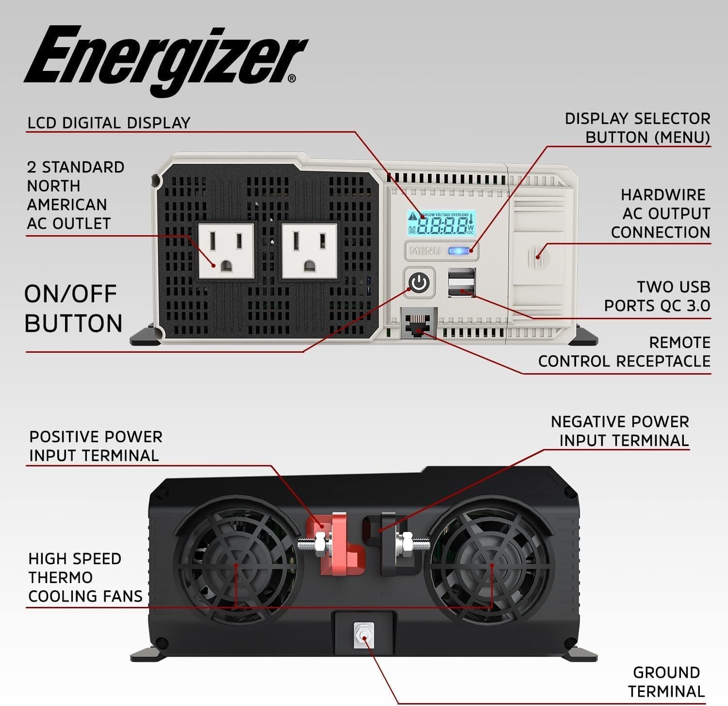 - ENERGIZER PURE SINE POWER INVERTER - 3000 watts continuous pure sine power, 6000 watts peak power, EP3000 pure sine wave power inverter converts 12V DC to 120V AC power, connect DC battery cables directly to your 12V battery and you have power on the go.