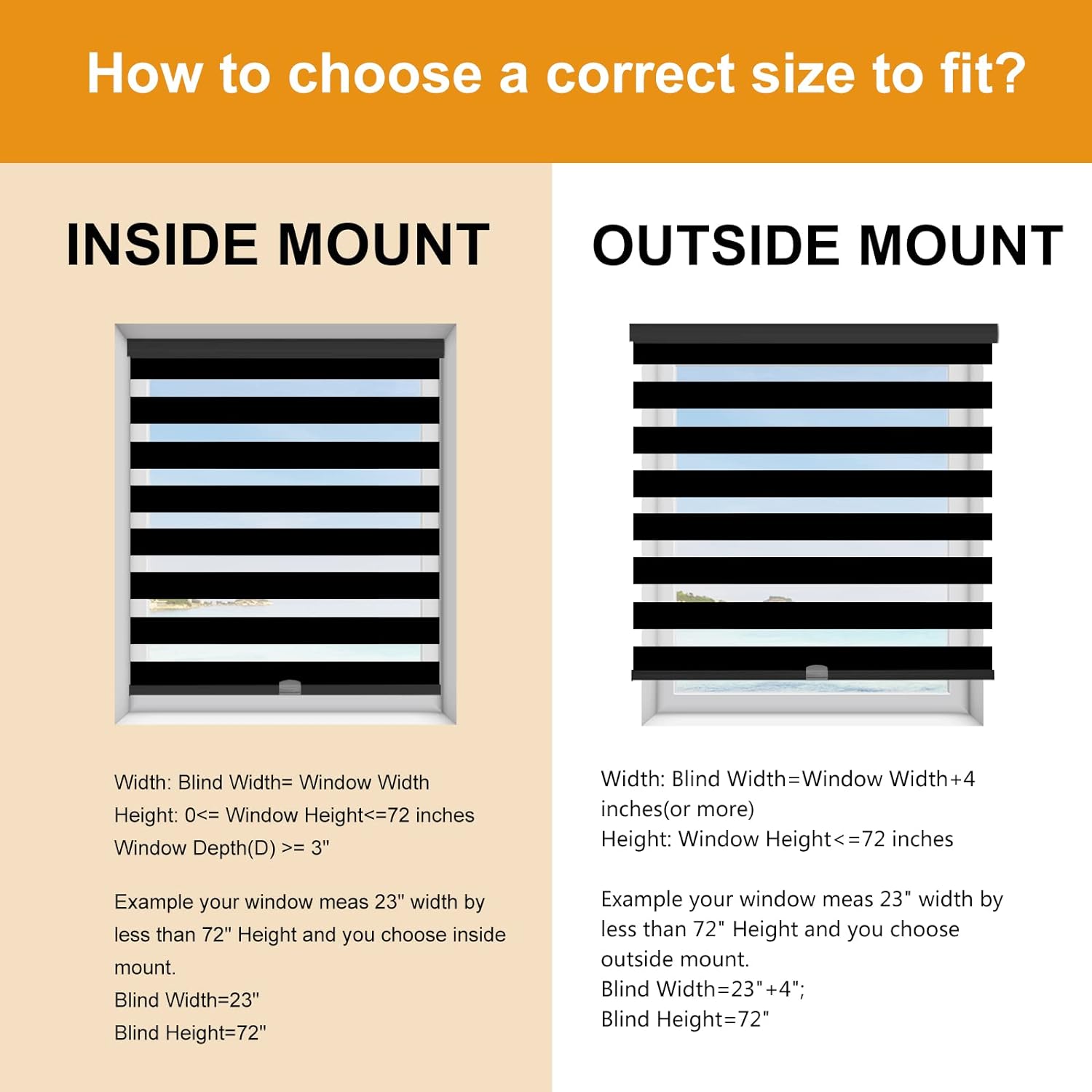 - 【How to choose a correct size to fit? Example your window meas 23" width x less than 72" Height.】INSIDE MOUNT: Window Width is Blind width. Blind Width=23"; Blind Height=72". OUTSIDE MOUNT: Plus at least 4" is blind width, Blind Width=23"+4"=27"; Blind Height=72".【Pls Note】Fabric width will be 0.8" narrower than the size of the blind.