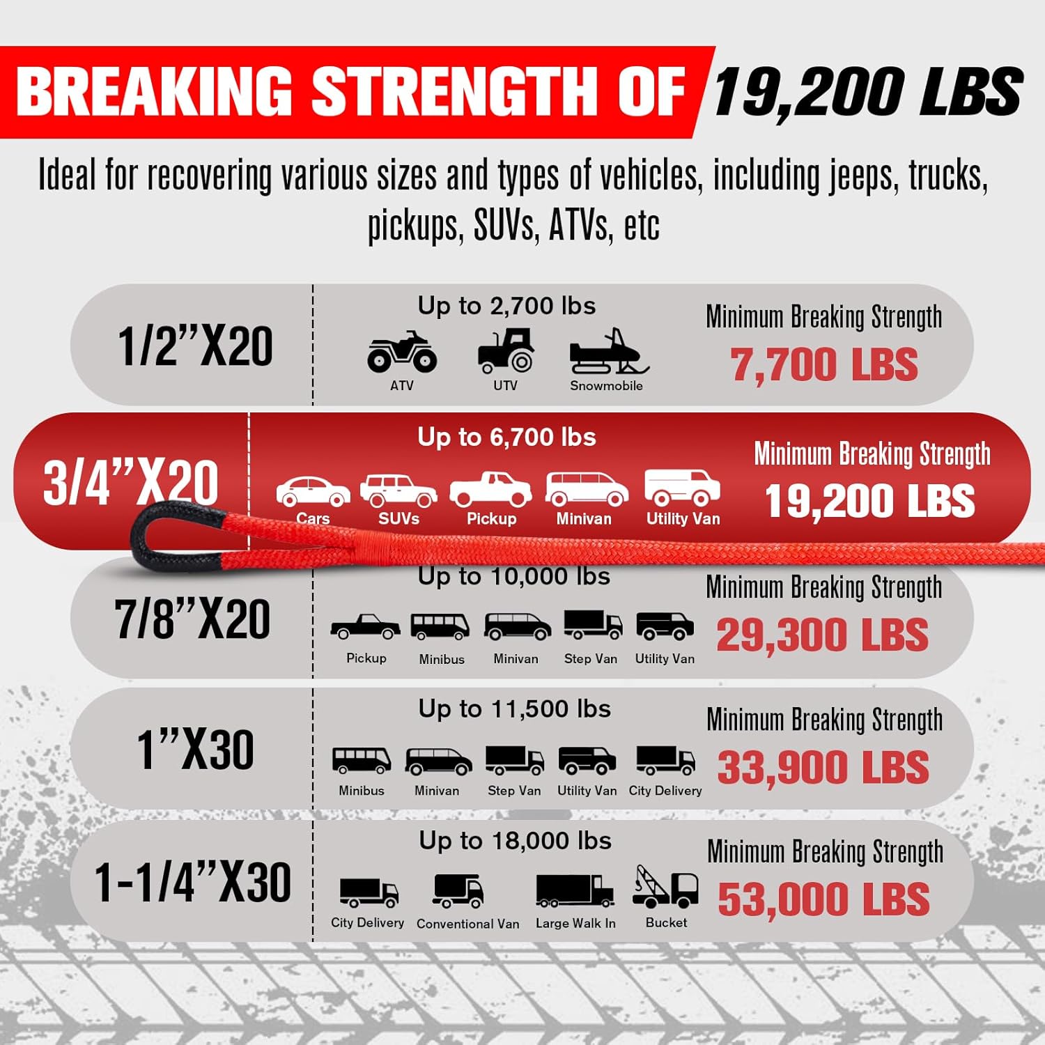 - FIERYRED Kinetic Recovery Rope features 3/4” thick x 20' long, 26500lbs minimum breaking strength, which is best utilized in anything from ATV/UTV to middle SUV's. This Rope is a safer and smoother way to assist stranded vehicles out of mud, sand, water, snow and more.