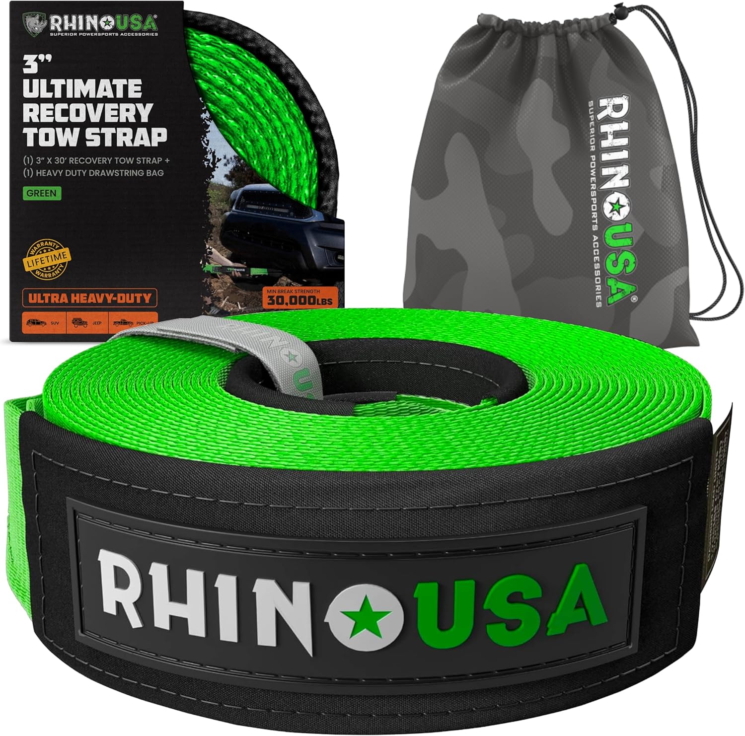 Rhino USA Recovery Tow Strap (3" x 30') - 31,518lb Break Strength - Emergency Recovery Strap Tow Rope for Truck, UTV, ATV & More - Heavy Duty Towing Strap for Offroad 4x4 Use - Compatible with Jeep