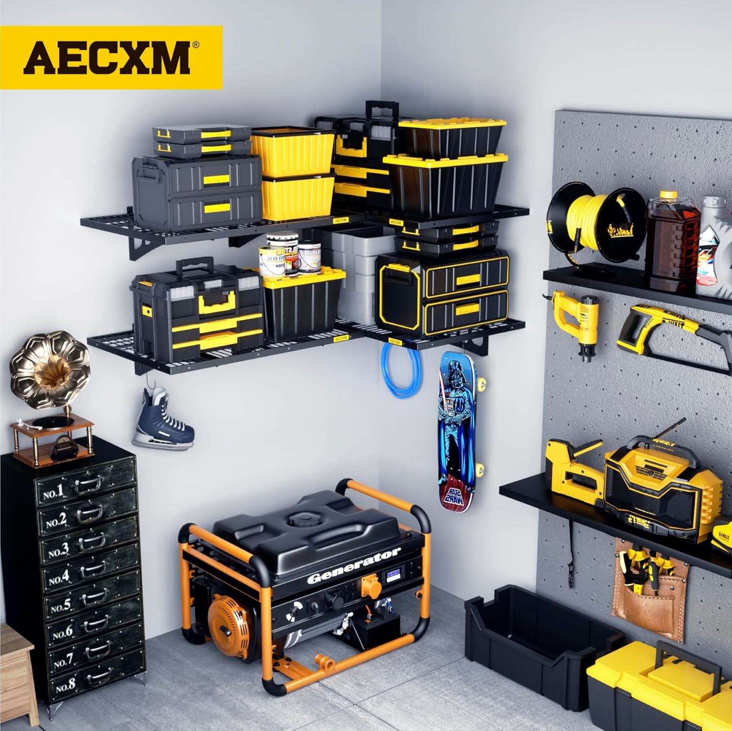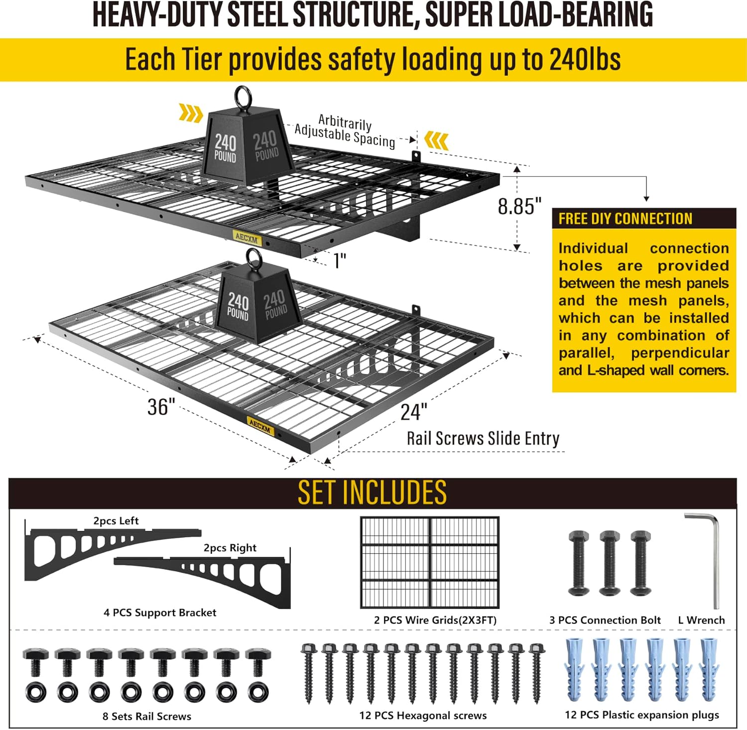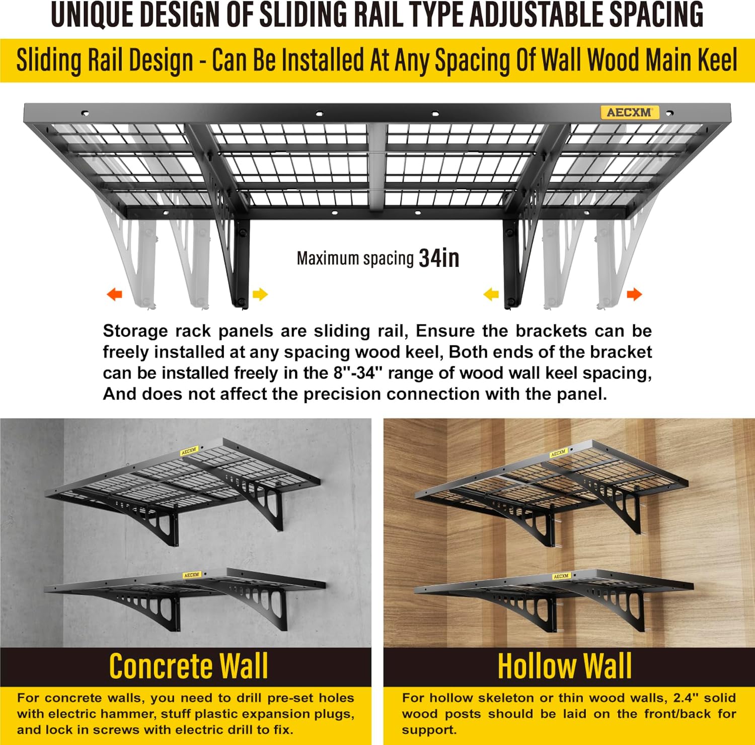 - 【Innovative Design】Unlike fixed-spacing systems, Aecxm garage storage shelves wall mounted feature sliding rail screws, allowing installation on wood studs spaced anywhere within the 36-inch garage shelf length. No more compatibility issues with uneven stud spacing