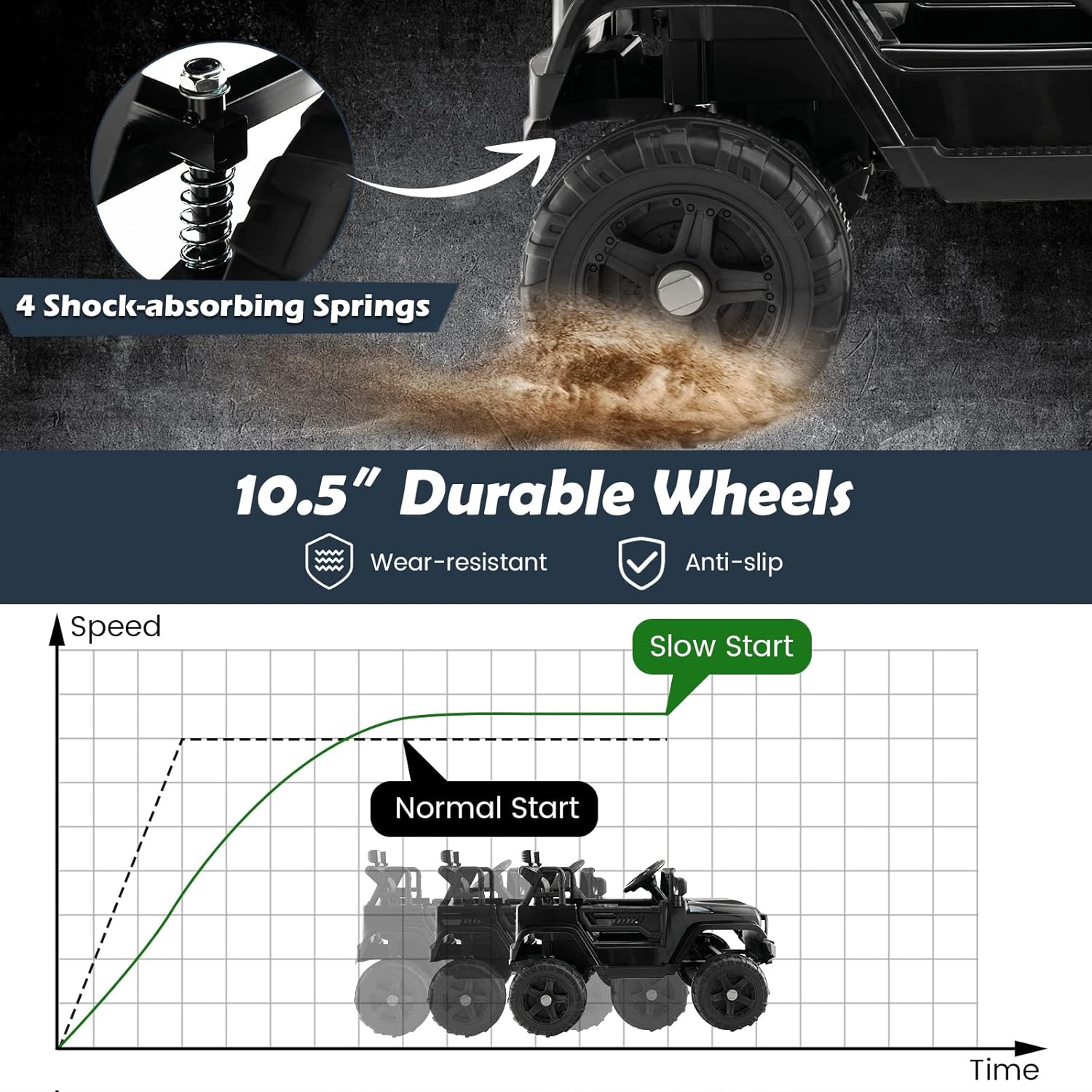- Slow Start & Safety Design: This electric ride on truck is built for child’s safety with the seat belt and safe door locks. With the slow start function and 4 shock-absorbing springs on the anti-slip and durable wheels, this electric toy car will start at a slow speed and run smoothly on different roads.
