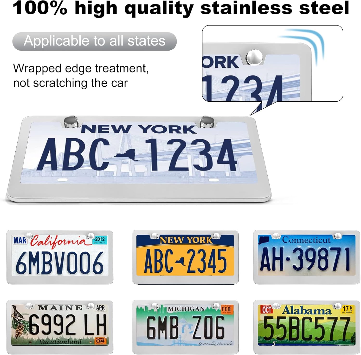 - STAINLESS STEEL LICENSE PLATE FRAME: The main characteristics are no rust, corrosion resistance, air and steam resistance. Wear-resistant, waterproof, not afraid of high temperature, easy to deal with all kinds of bad weather, avoid light pollution, easy to maintain.