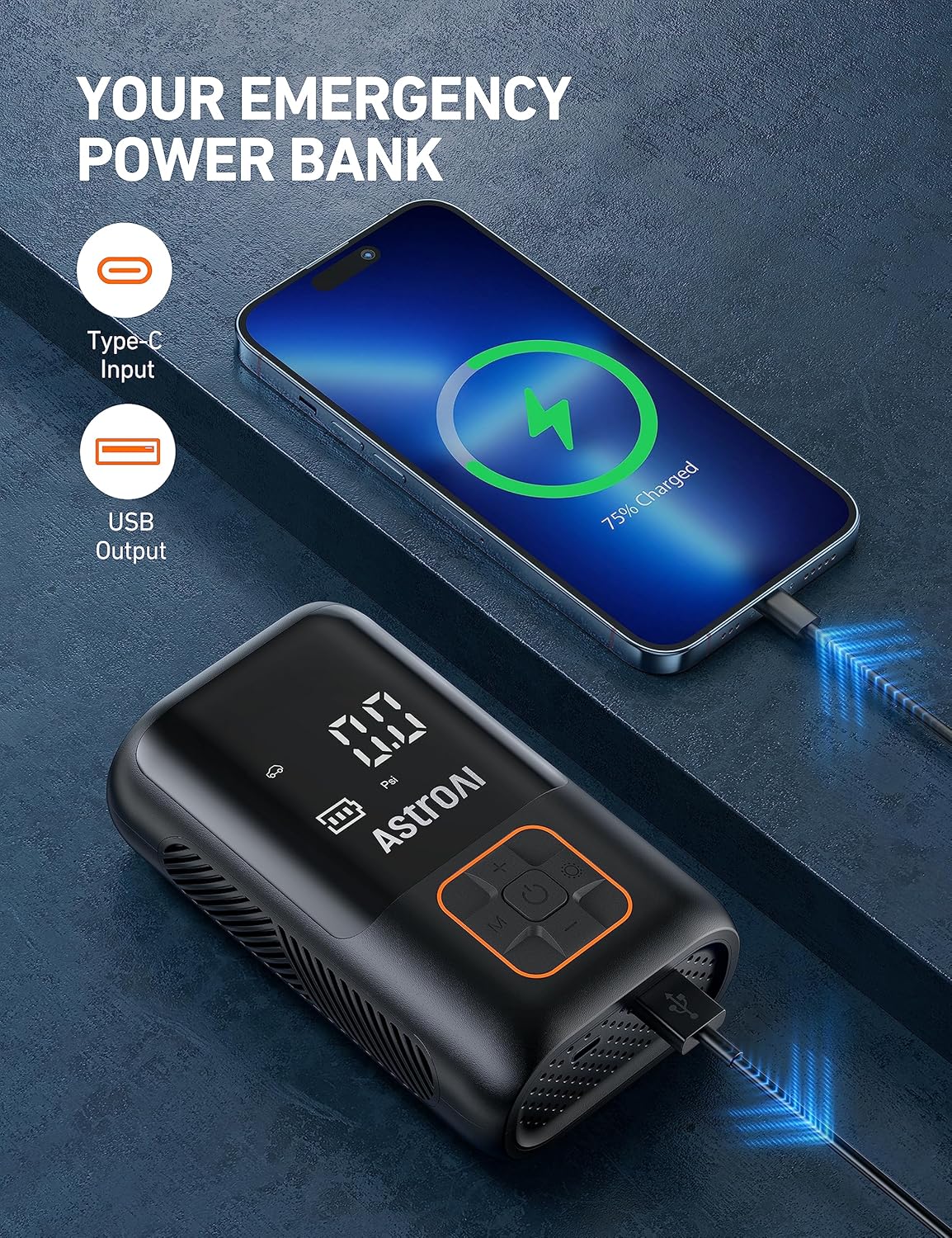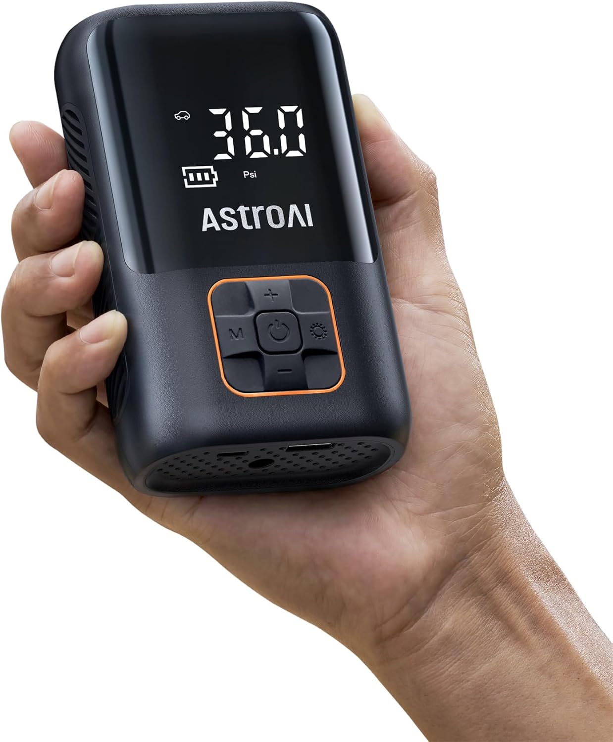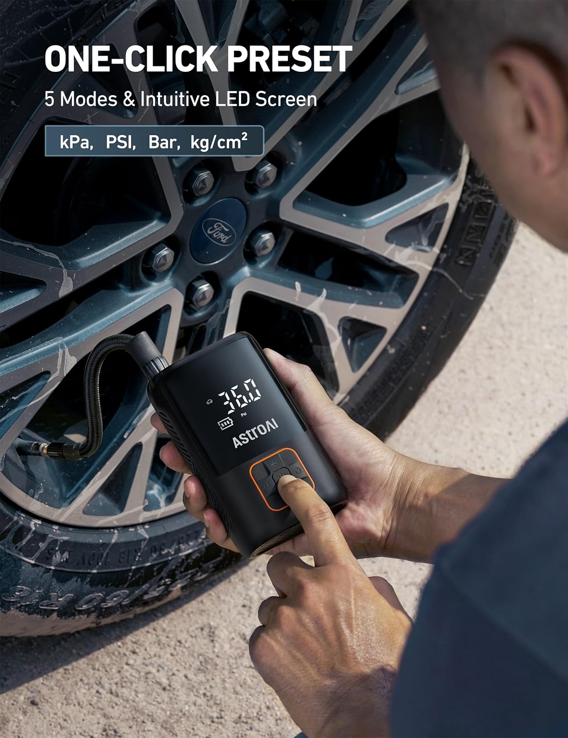 AstroAI Tire Inflator Portable Air Compressor Cordless Ultra-Lightweight Car Tire Pump 150 PSI Bike Pump with LED Lights & Digital Screen Air Pump for Cars, Motorcycles, E-Bikes, Balls-Black,Regular