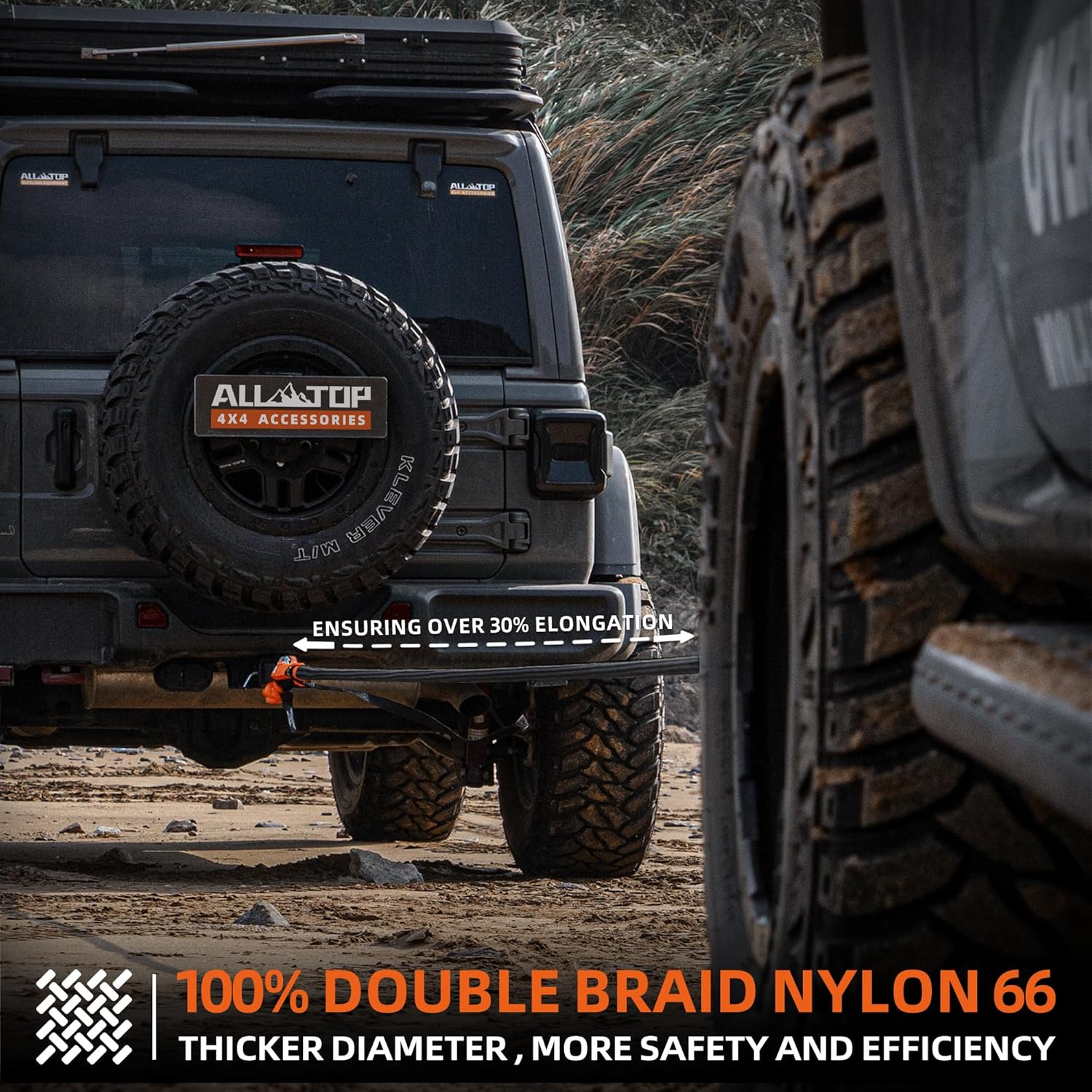 - 【RECOVERY MUST-HAVE】 ALL-TOP Kinetic Rope is one of the most reliable overlanding gear you should have to safeguard your exploring trips. Double braided with 100% Nylon N66 and coated with Mil-spec Polymers, provides trustable 48000Lbs Break Strength Rating and 16000Lbs Work Load Limit.