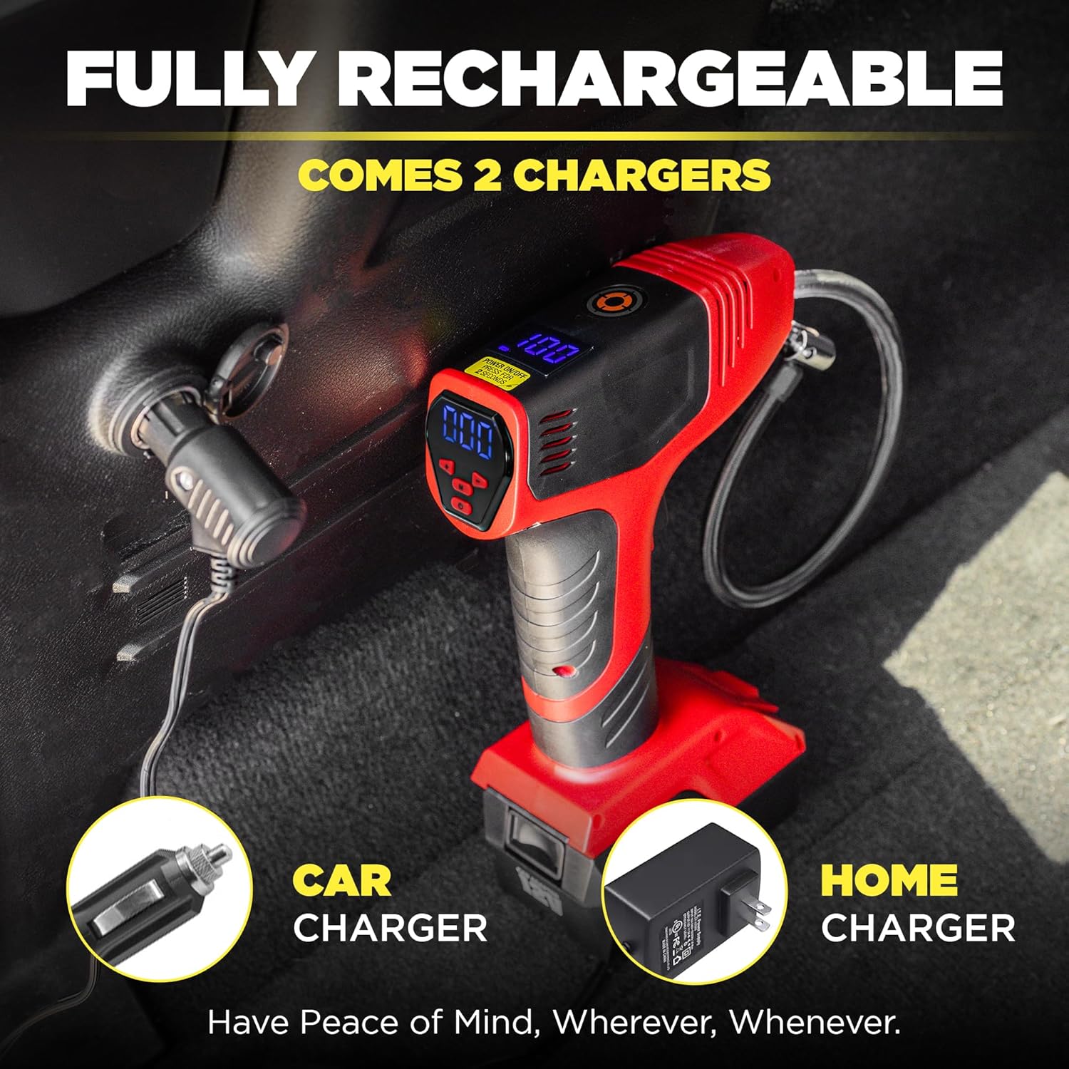 - Rechargeable and Convenient: Comes equipped with 2 different chargers - a home charger, and a cigarette lighter car charger, offering you greater flexibility and convenience. Compact in size with included storage bag makes storing this mini air compressor easy and clutter-free