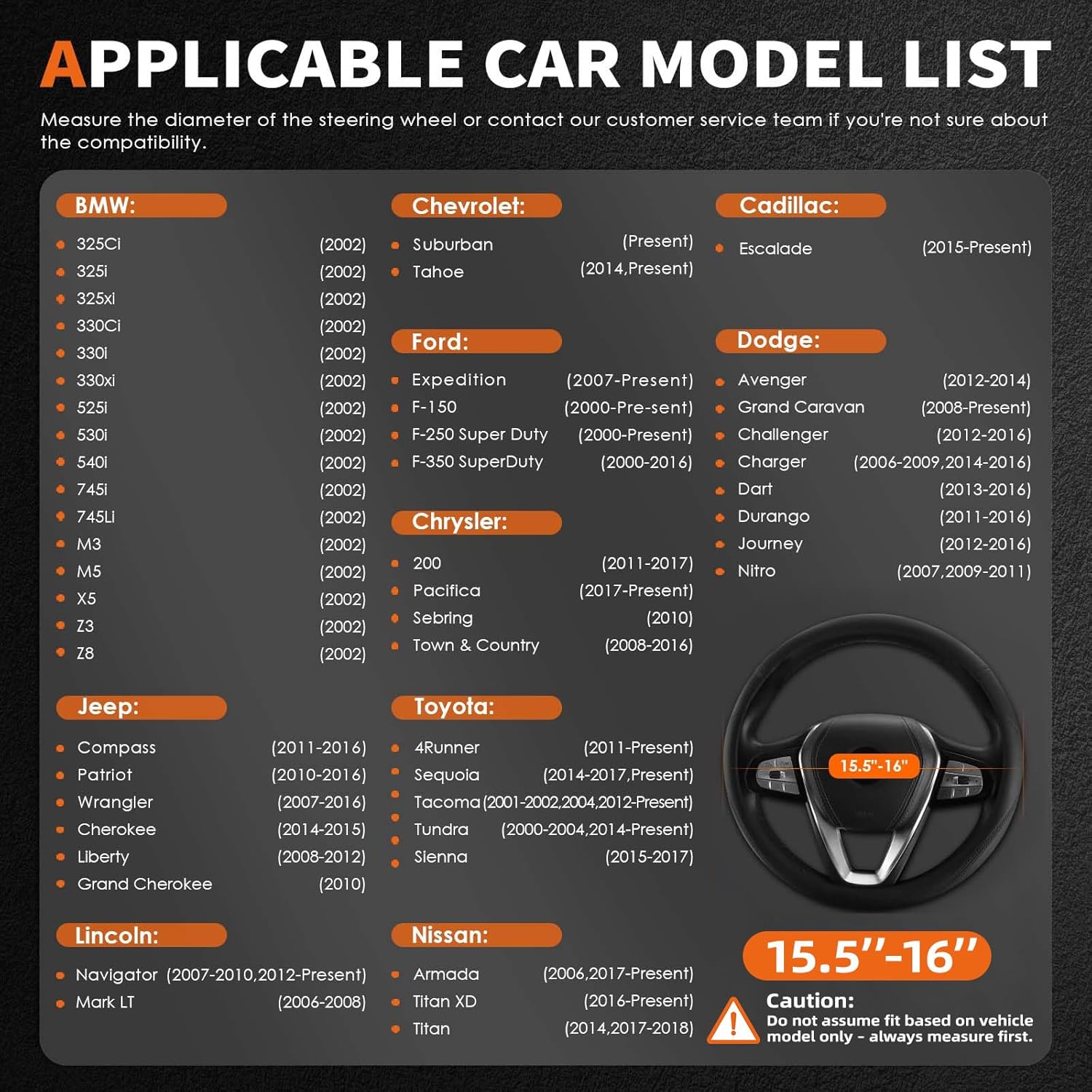 - FITS LARGE STEERING WHEELS–SIZE GUIDE INCLUDED: This HOTOR leather steering wheel cover is designed for large-size steering wheels (15.5–16.0 inches ). It fits full-size pickup trucks, large SUVs, and commercial vans, such as Ford F-150, RAM 1500, Chevrolet Tahoe, and Ford Transit.Before ordering, we strongly recommend measuring your steering wheel diameter to ensure the correct size selection
