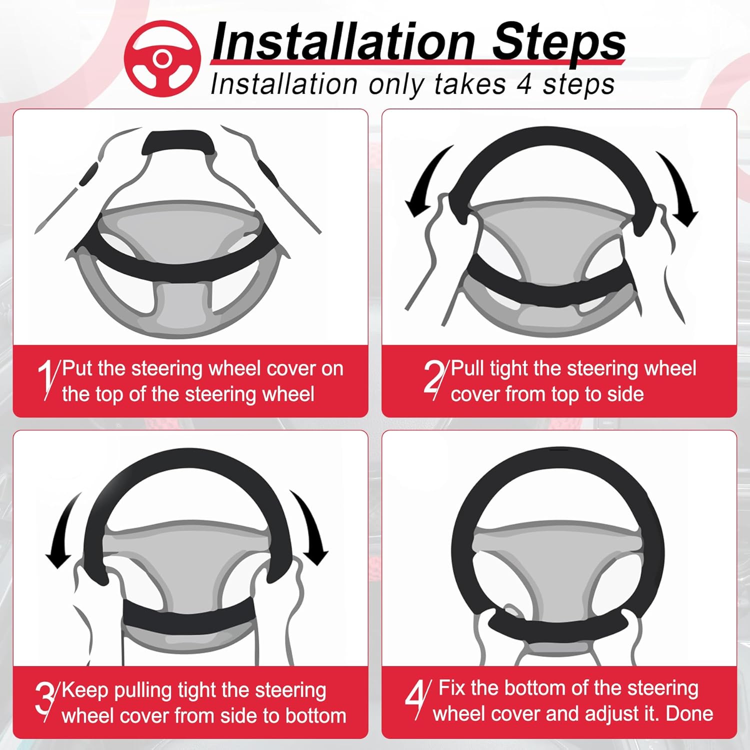 - 【Easy to install】: Because of the elastic stretch rubber band, Any adult can easy install this steering wheel cover, no tools required.