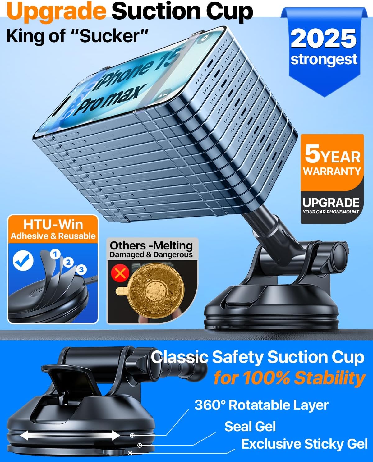 - [Original 4 Industry-leading Technologies for Top Safety - Thanks to Millions of Users' Voice] 1) Extreme 80LBS sticky suction force. 2) Reusable suction cup when removed and leave no trace. 3) Extreme 10,000 times vibration resistance. 4) Extra support stabilizer enforces the stability